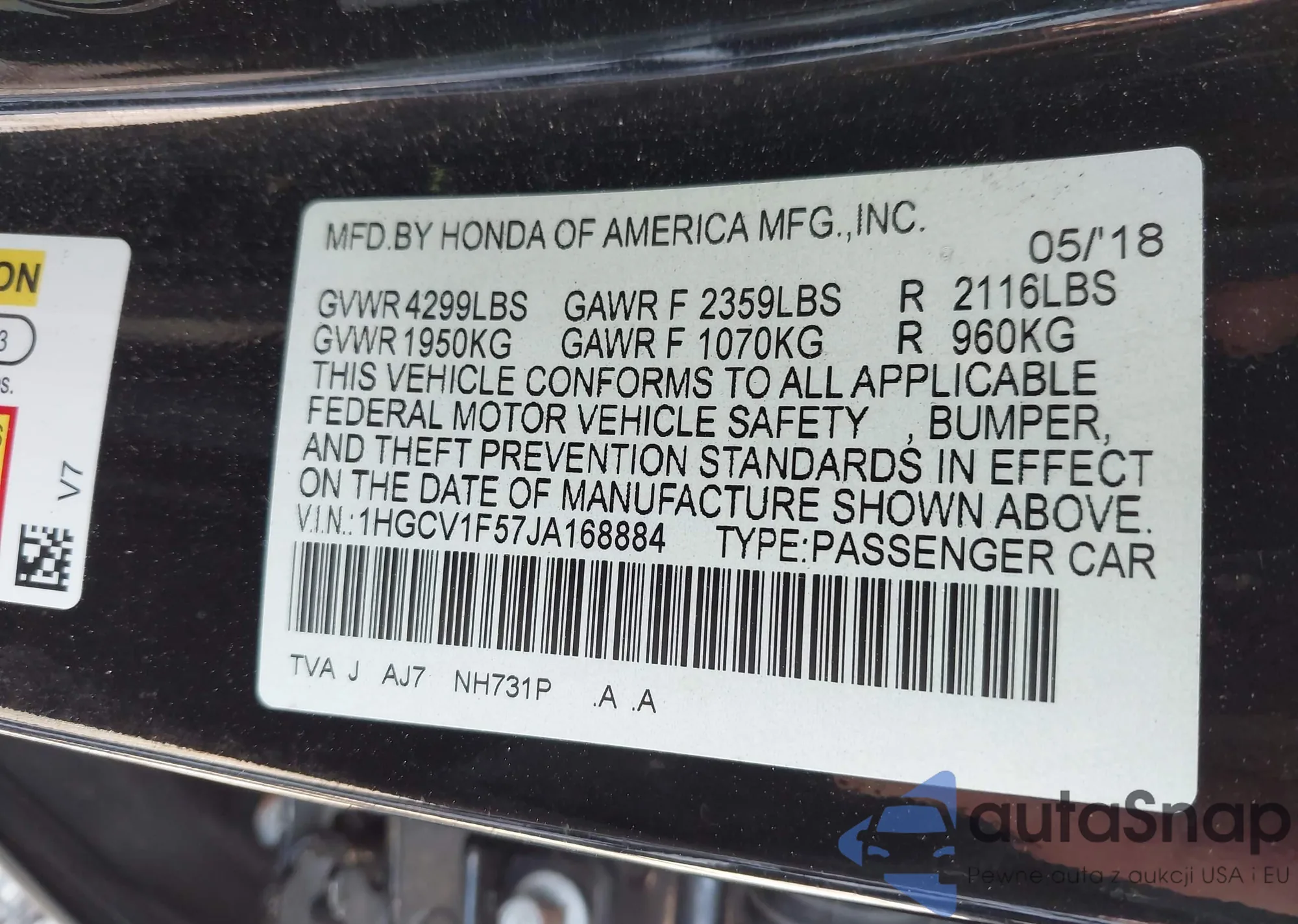 LOT: 43381881 VIN: 1HGCV1F57JA168884