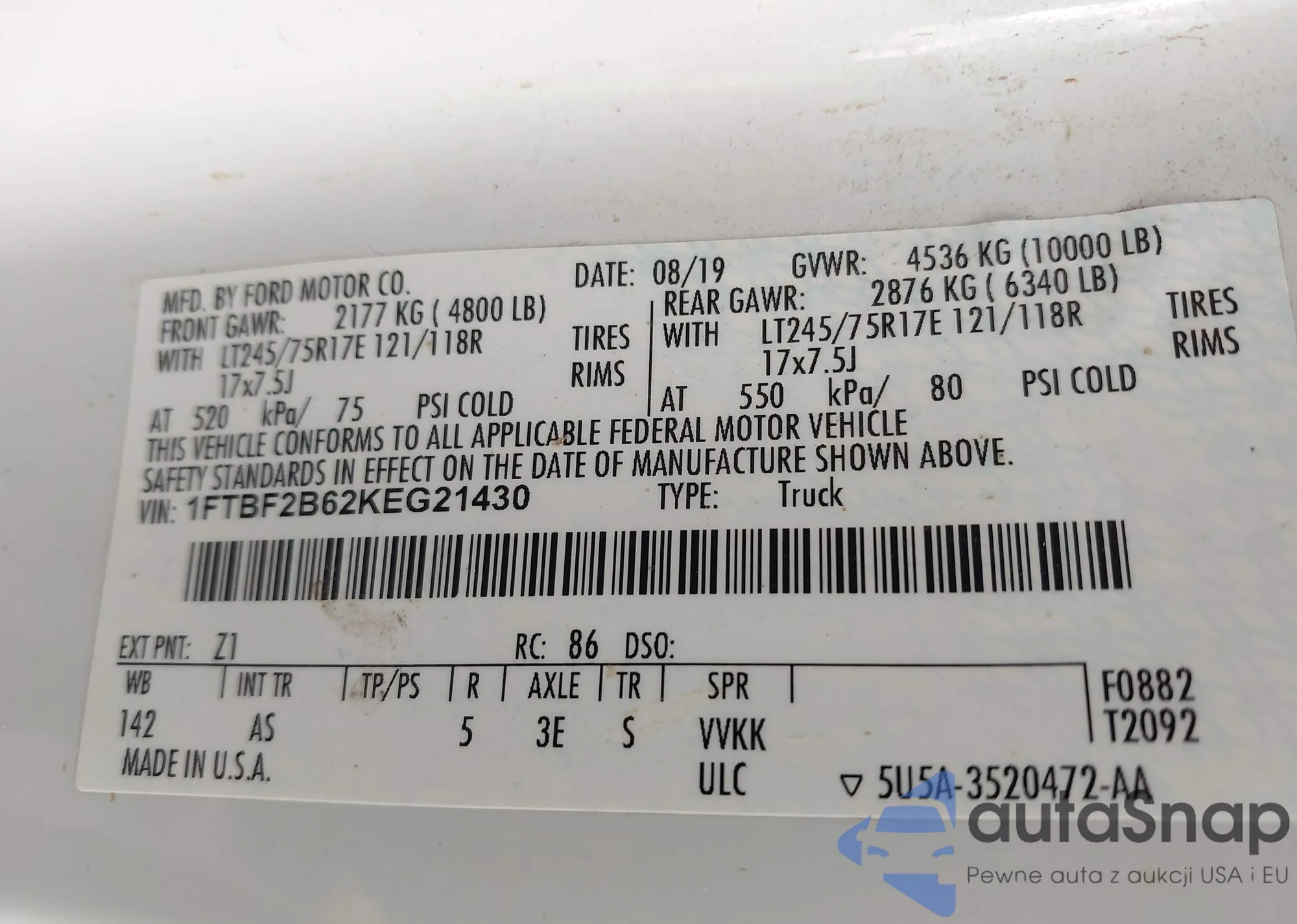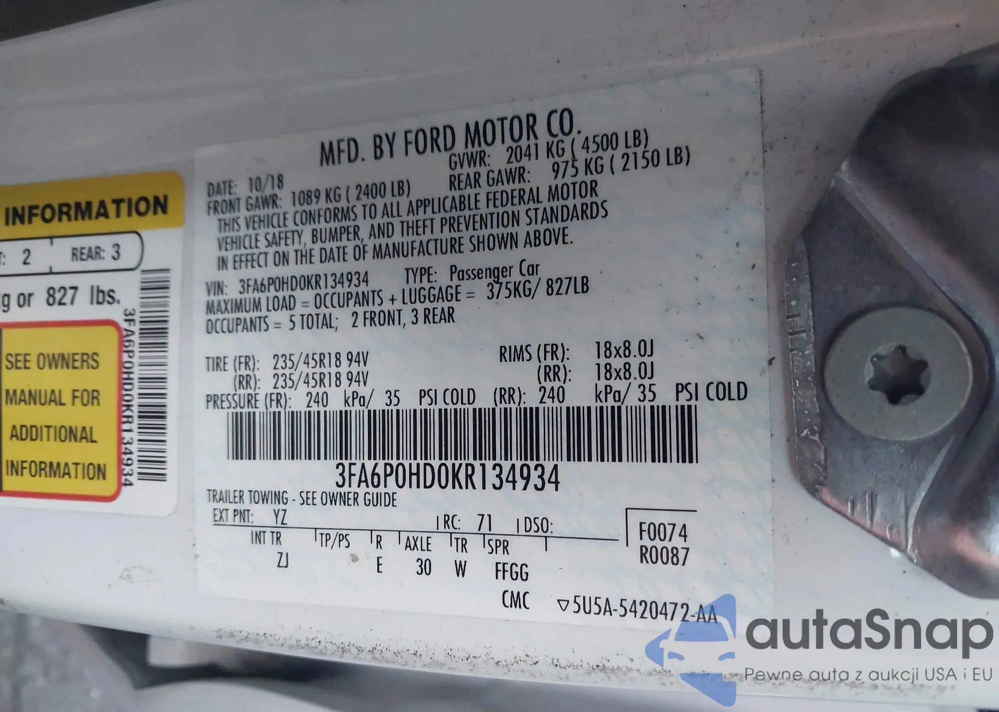 LOT: 43919383 VIN: 3FA6P0HD0KR134934