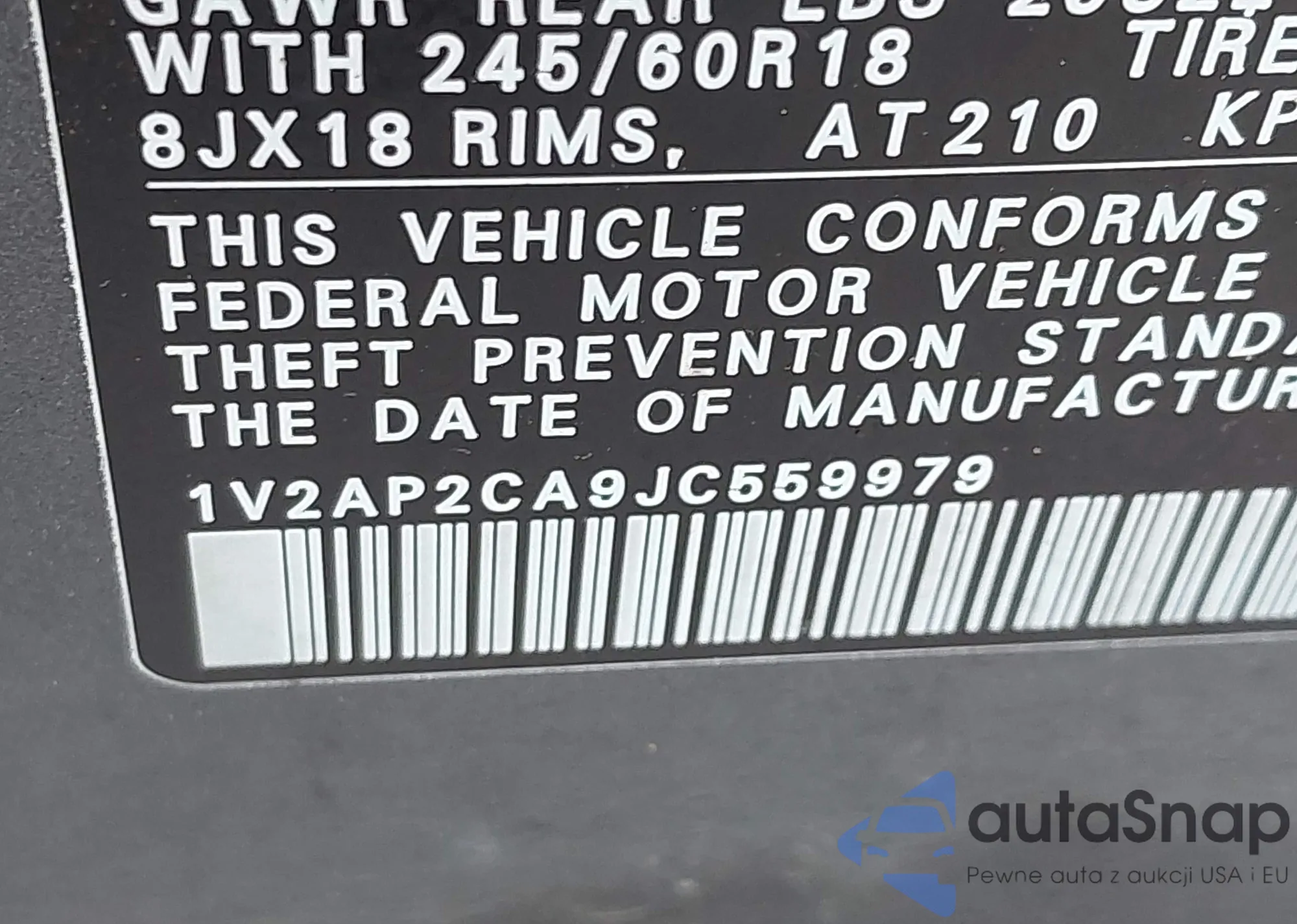 LOT: 43932041 VIN: 1V2AP2CA9JC559979