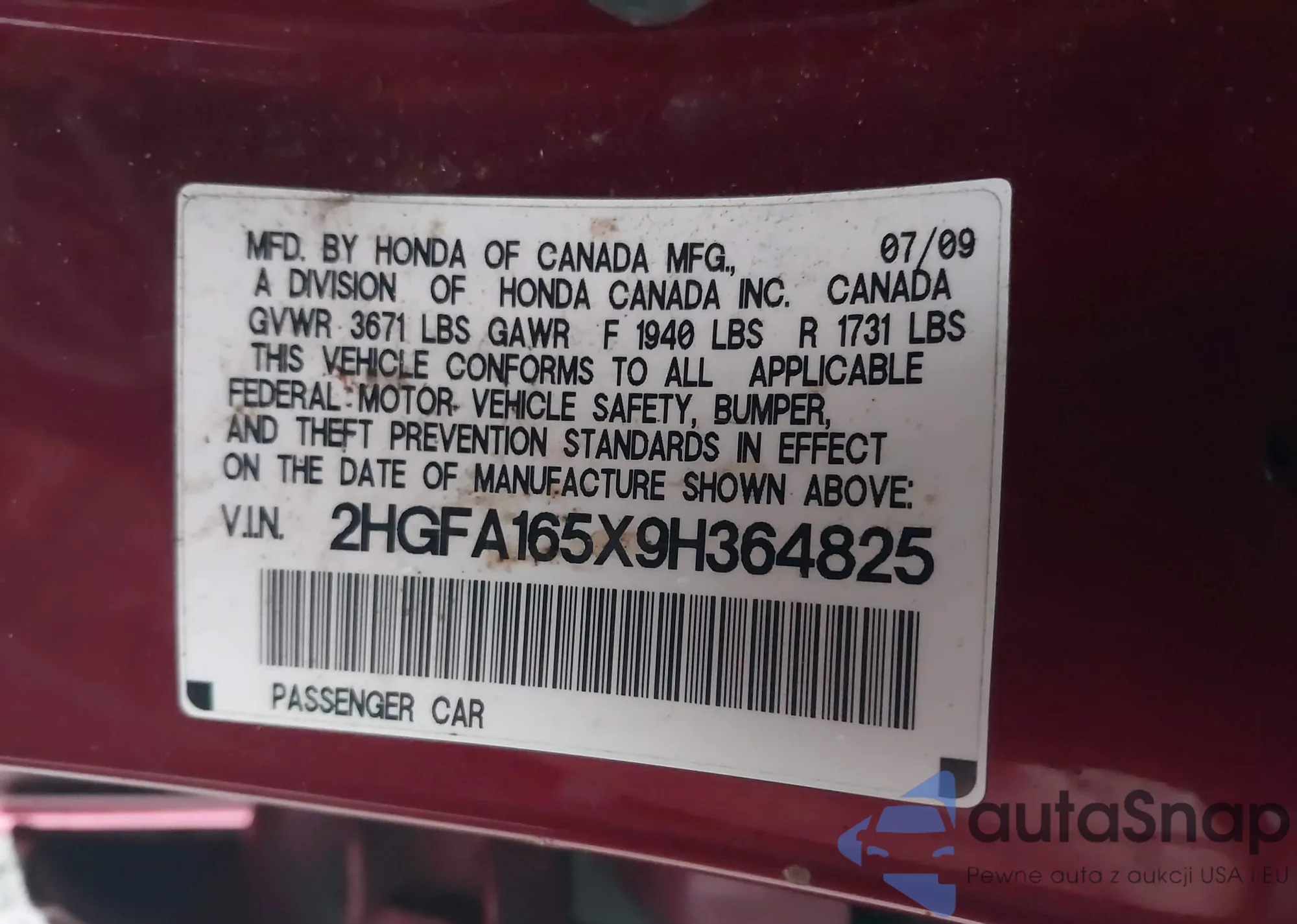 • VIN 2HGFA165X9H364825