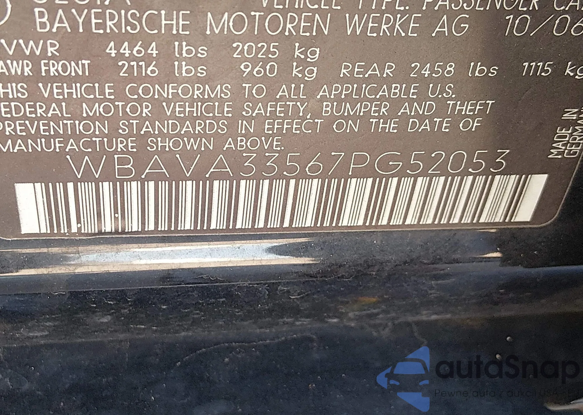 • VIN WBAVA33567PG52053