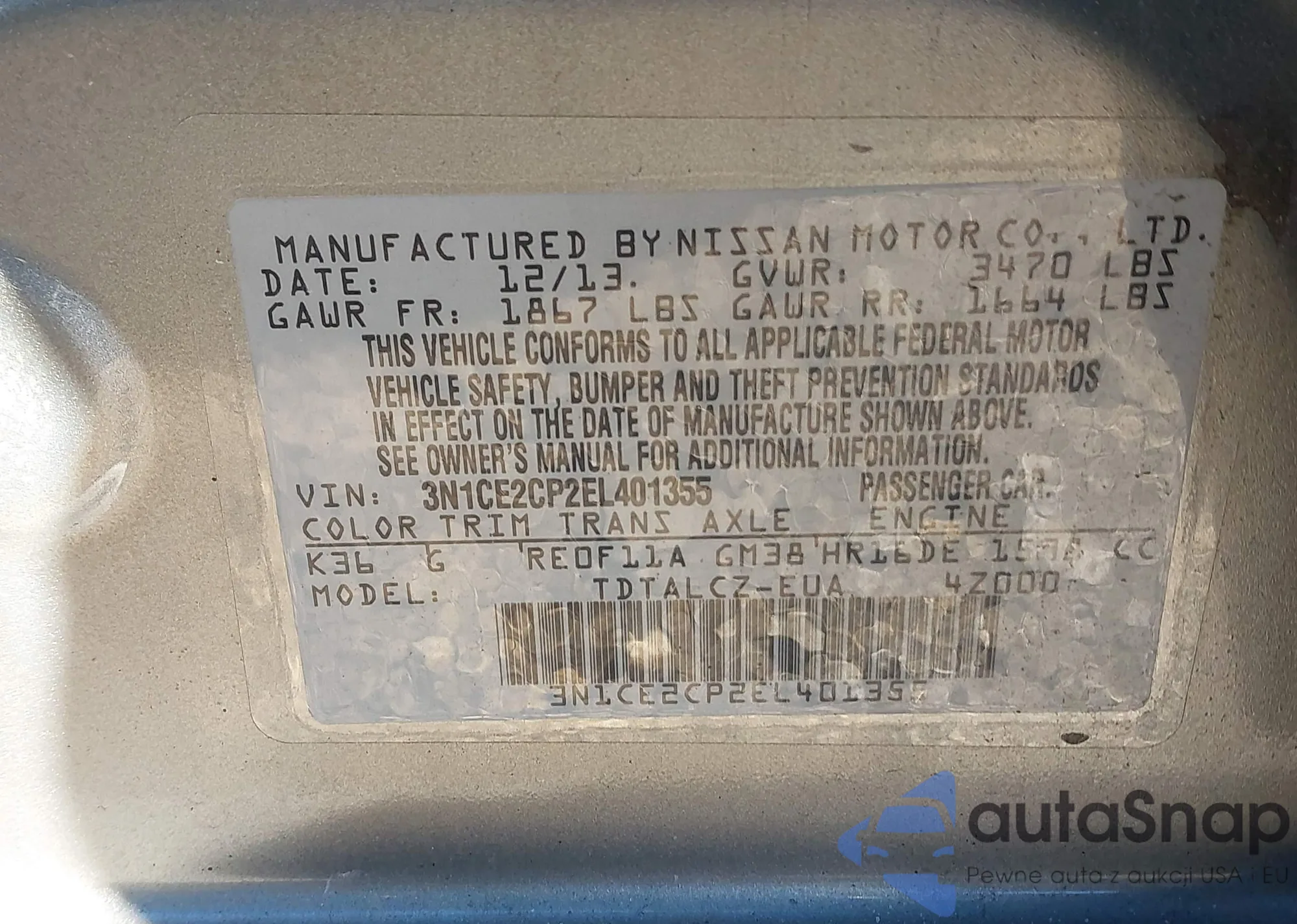 LOT: 43802001 VIN: 3N1CE2CP2EL401355