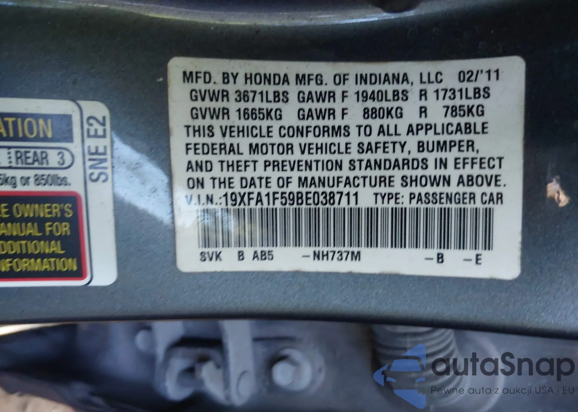 • VIN 19XFA1F59BE038711