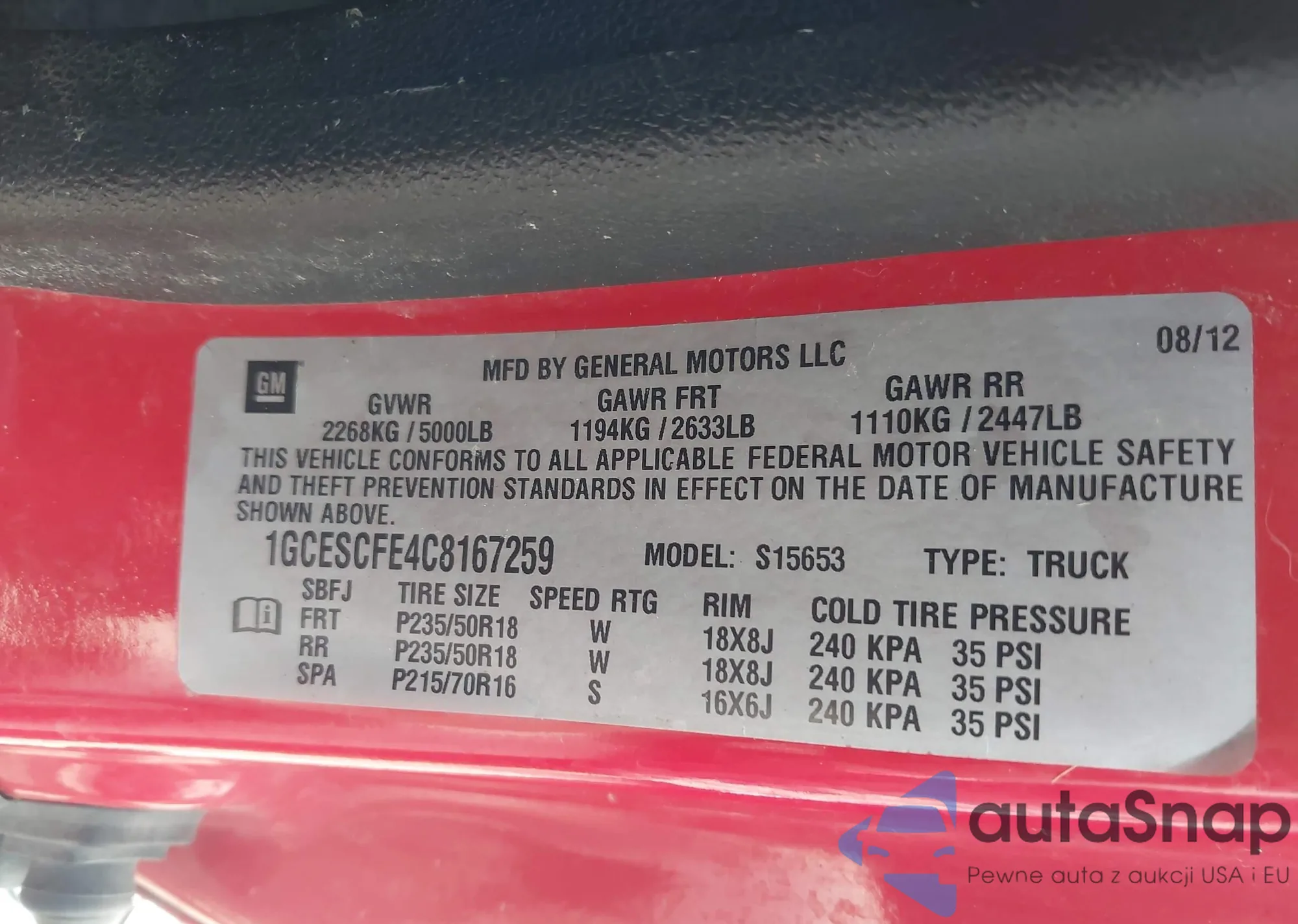 LOT: 42723937 VIN: 1GCESCFE4C8167259