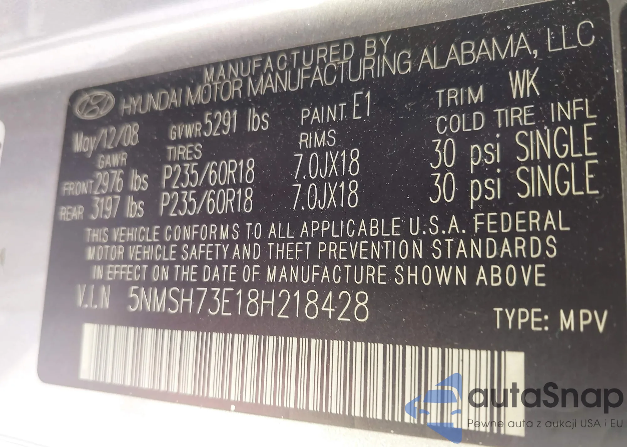 LOT: 43496314 VIN: 5NMSH73E18H218428