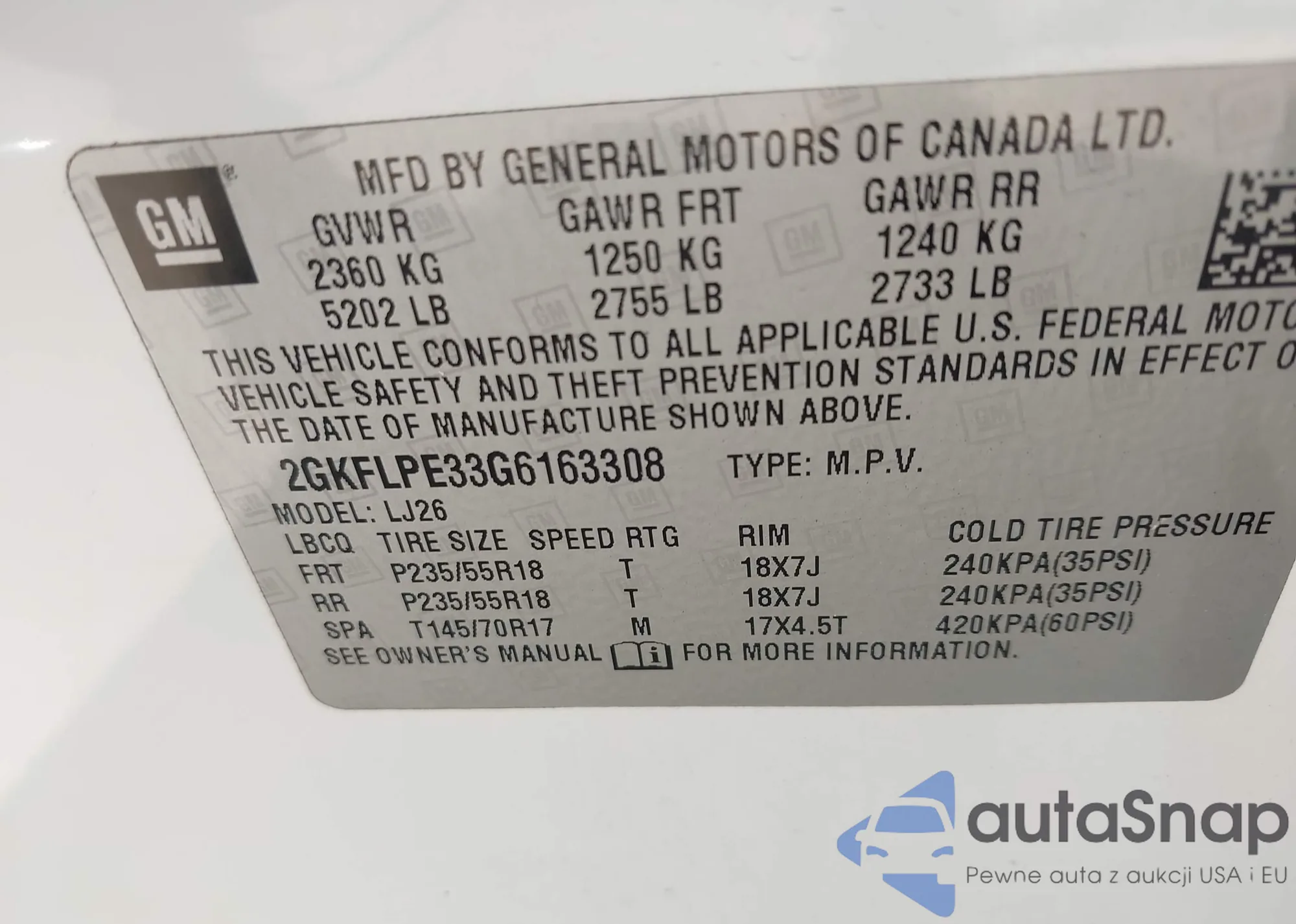 LOT: 43267356 VIN: 2GKFLPE33G6163308