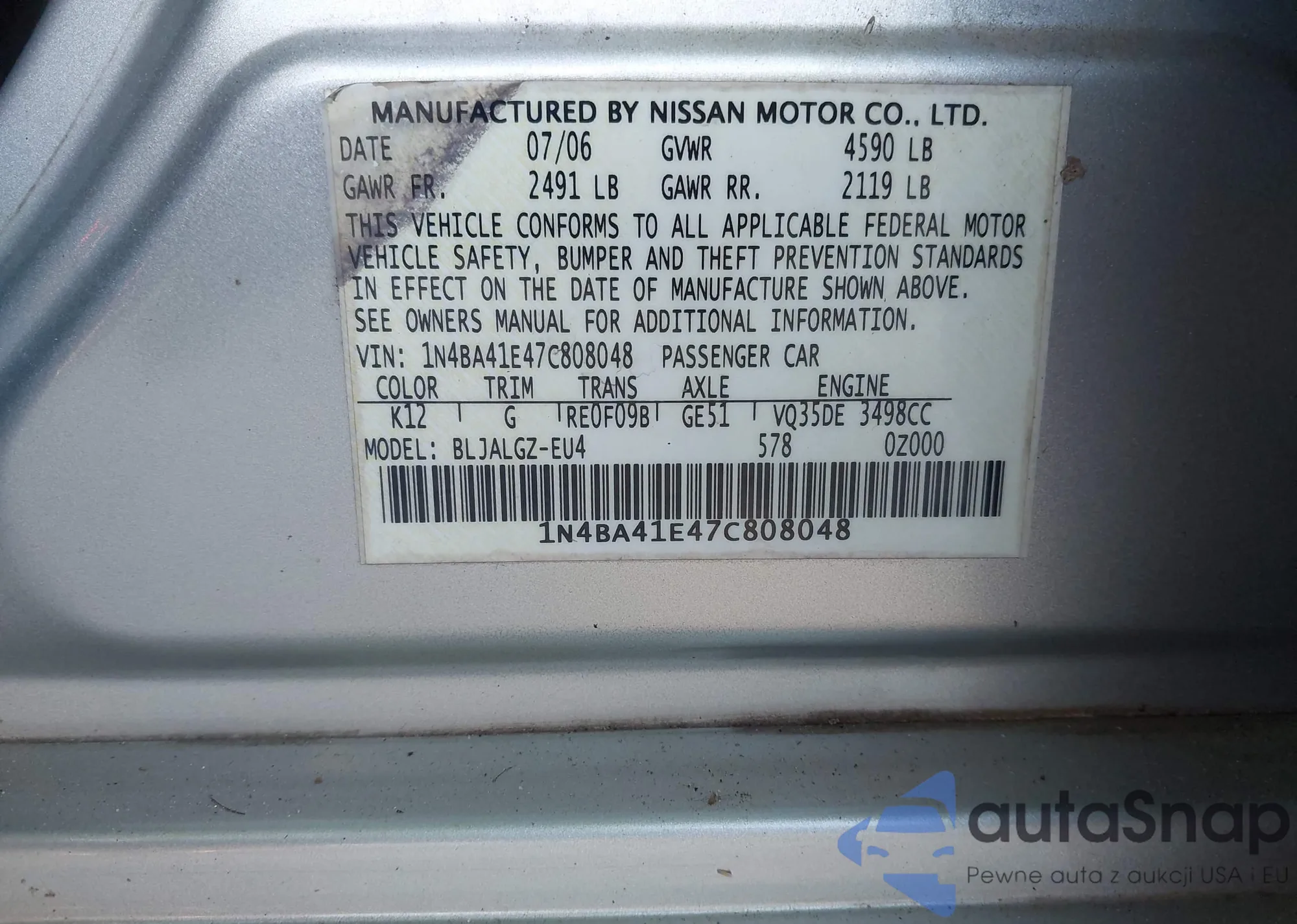 LOT: 43781667 VIN: 1N4BA41E47C808048