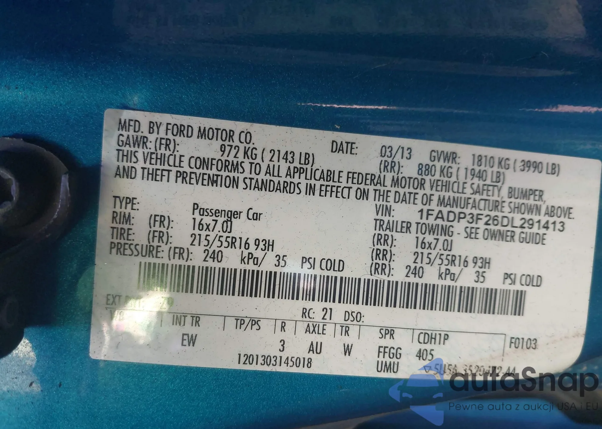• VIN 1FADP3F26DL291413