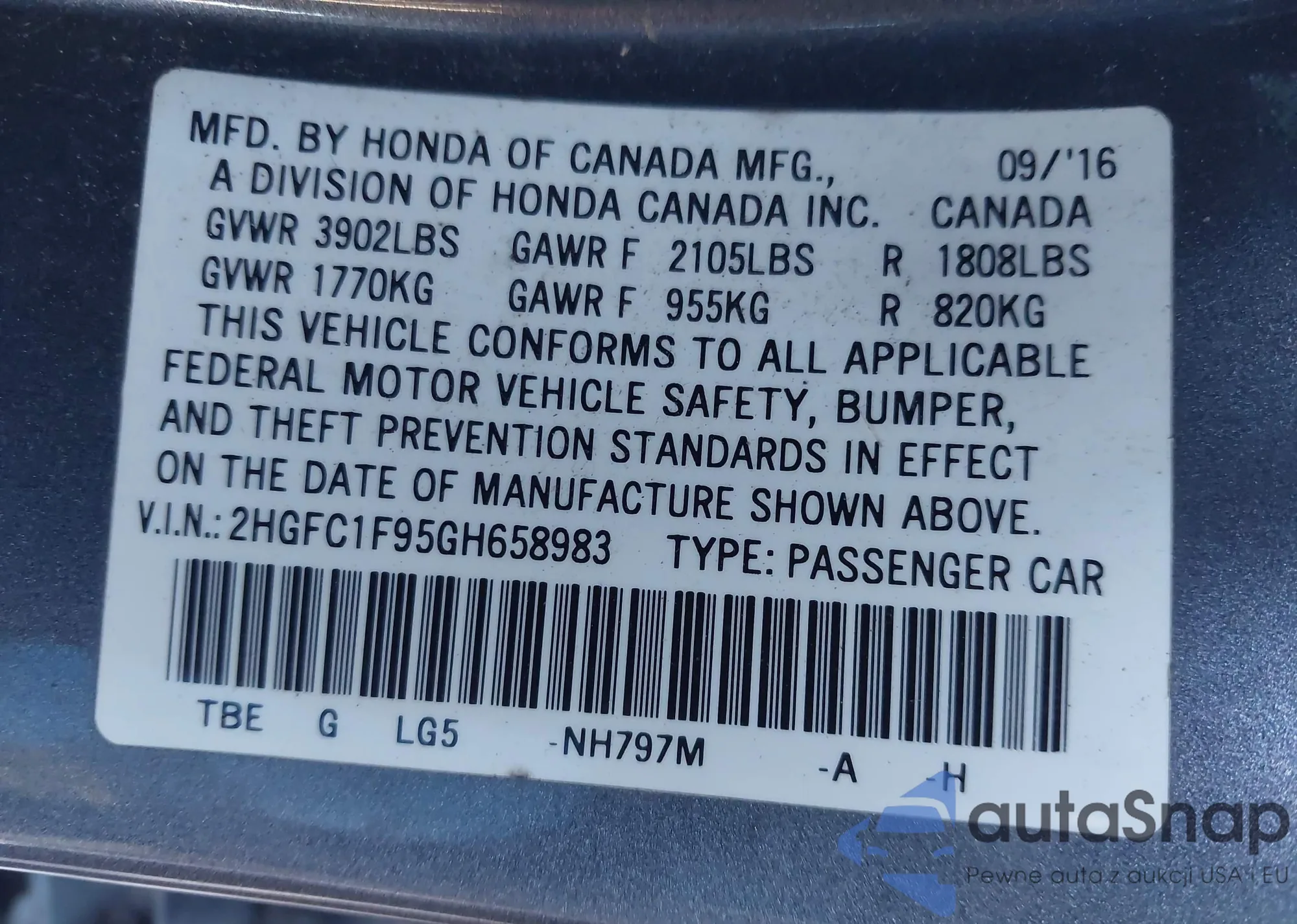 • VIN 2HGFC1F95GH658983