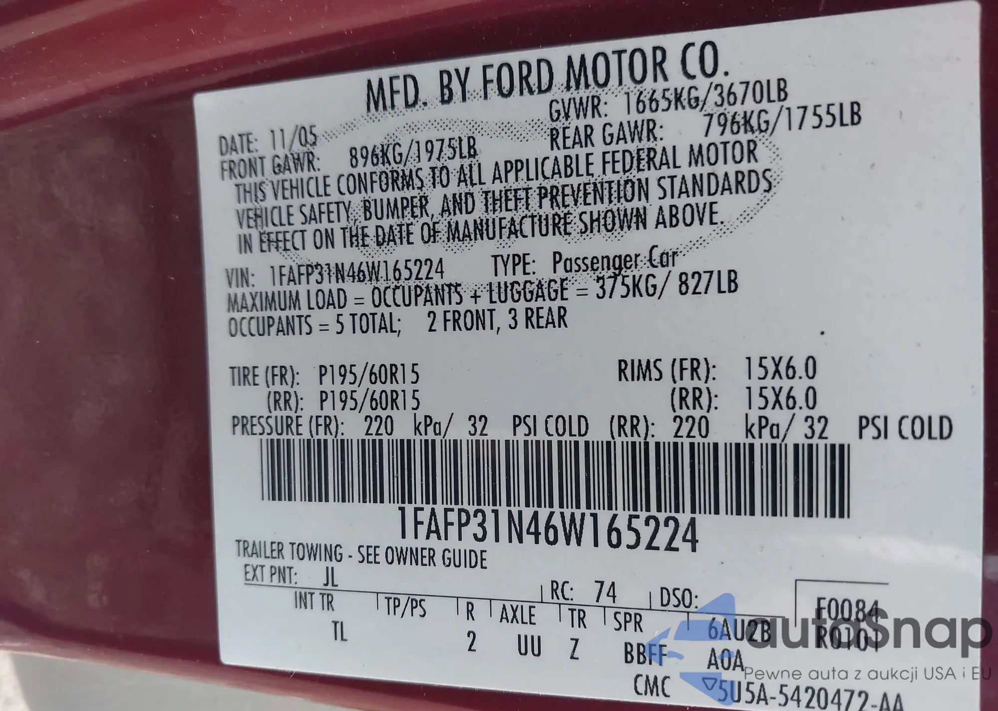 LOT: 44044309 VIN: 1FAFP31N46W165224