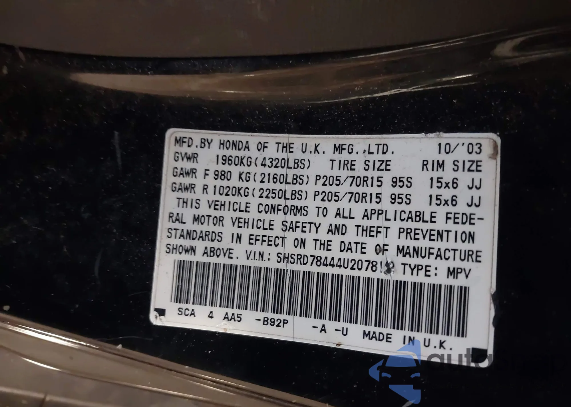 • VIN 5FNYF4H99BB002944