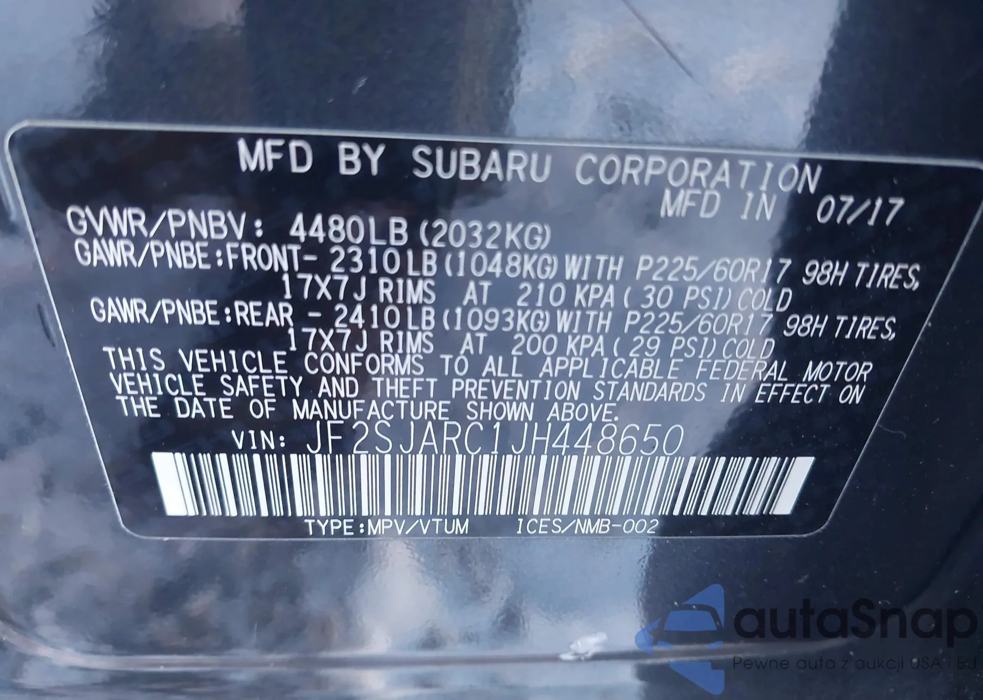 LOT: 43938962 VIN: JF2SJARC1JH448650