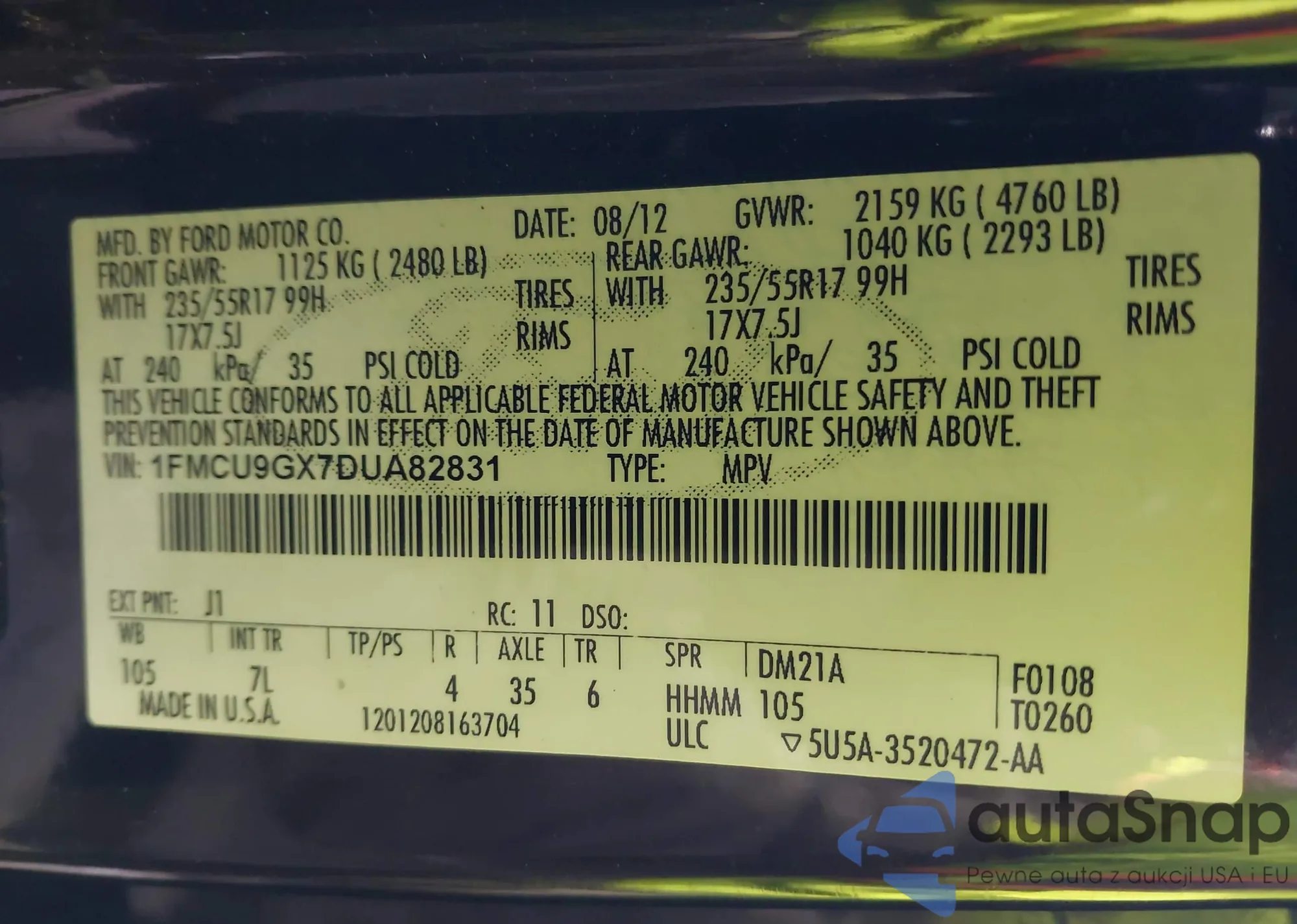 • VIN 5XYKUDA63DG367806