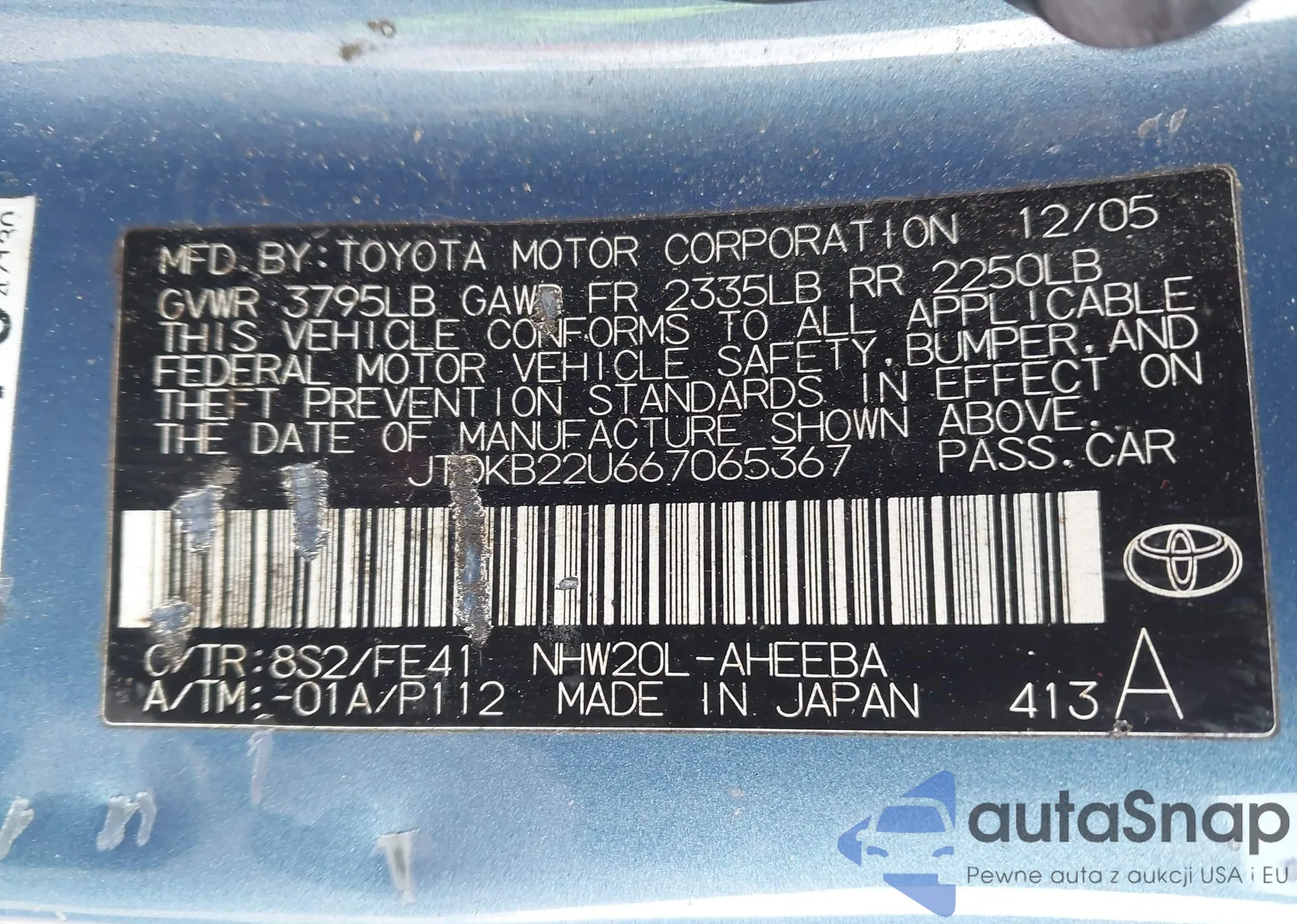 LOT: 43935584 VIN: JTDKB22U667065367