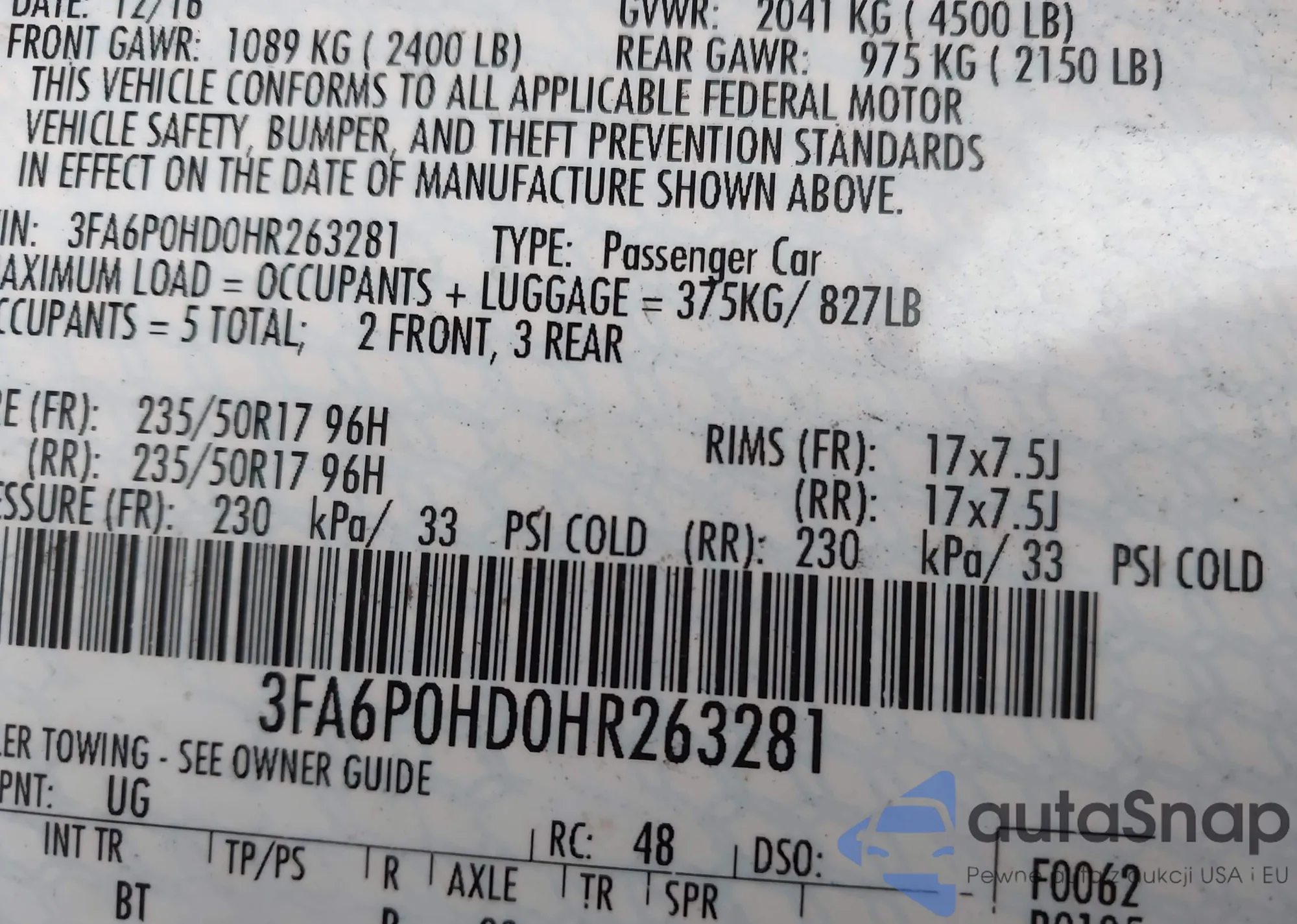 LOT: 43942091 VIN: 3FA6P0HD0HR263281