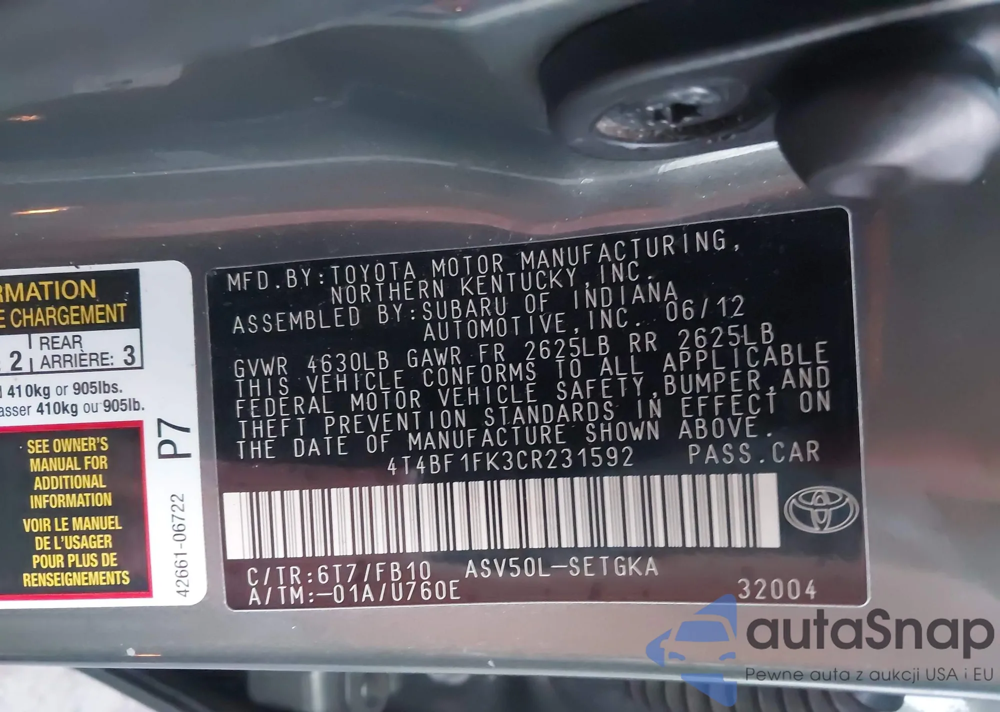 • VIN 4T4BF1FK3CR231592