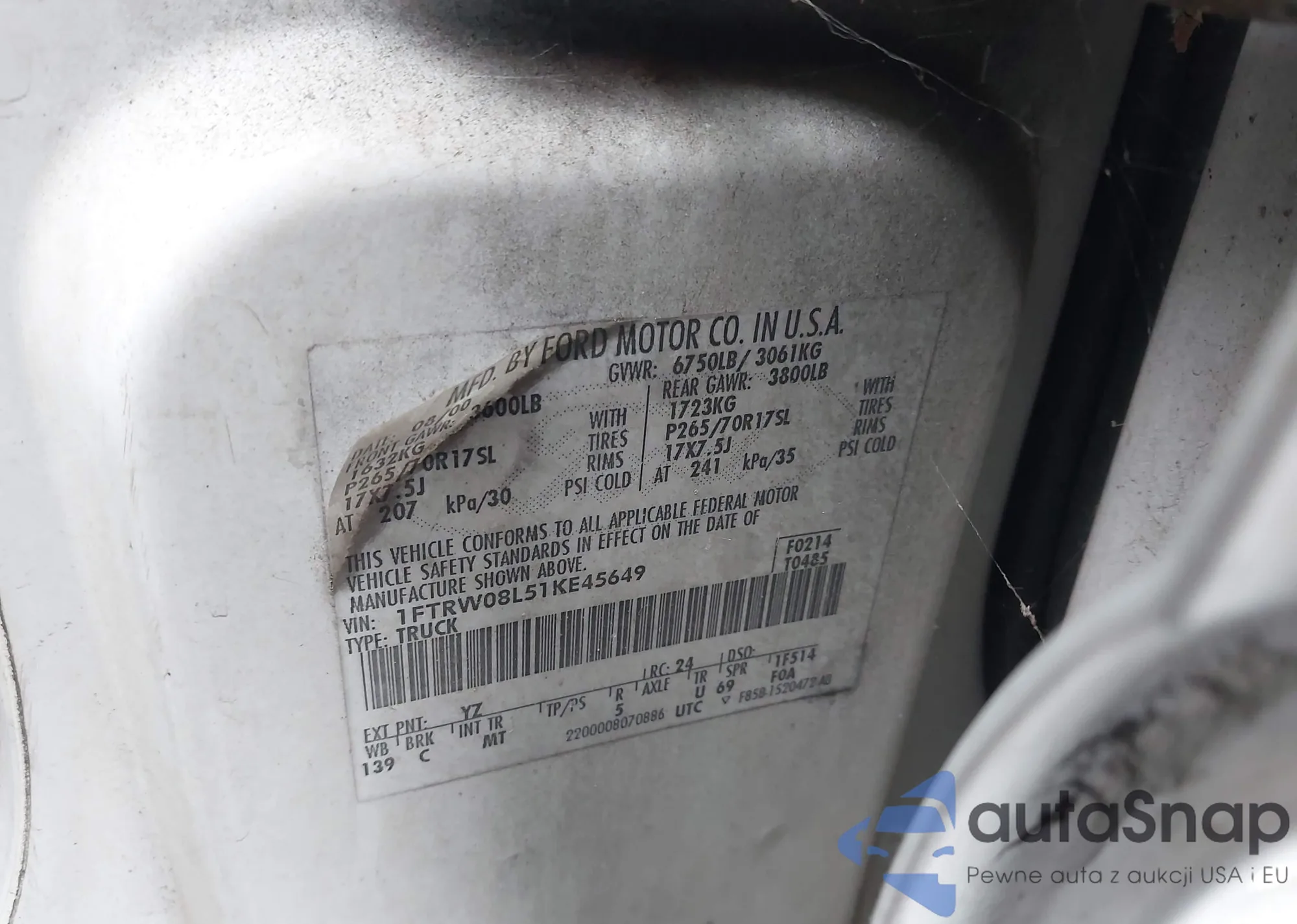 LOT: 43876023 VIN: 1FTRW08L51KE45649
