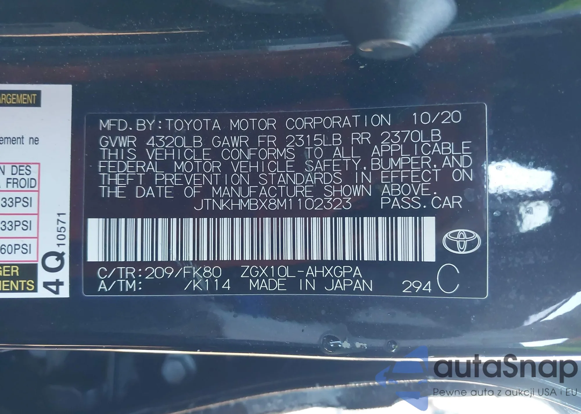 LOT: 43734660 VIN: JTNKHMBX8M1102323