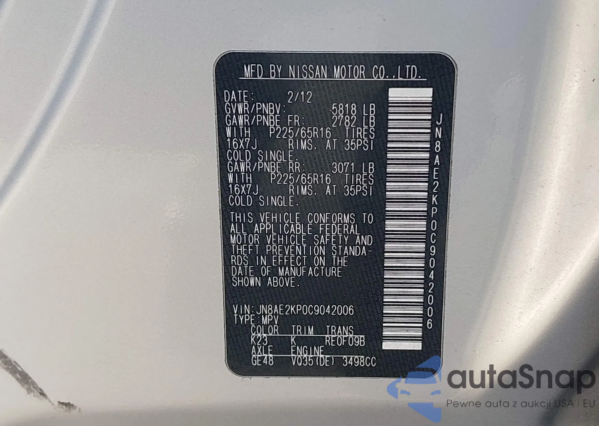 LOT: 43966115 VIN: JN8AE2KP0C9042006