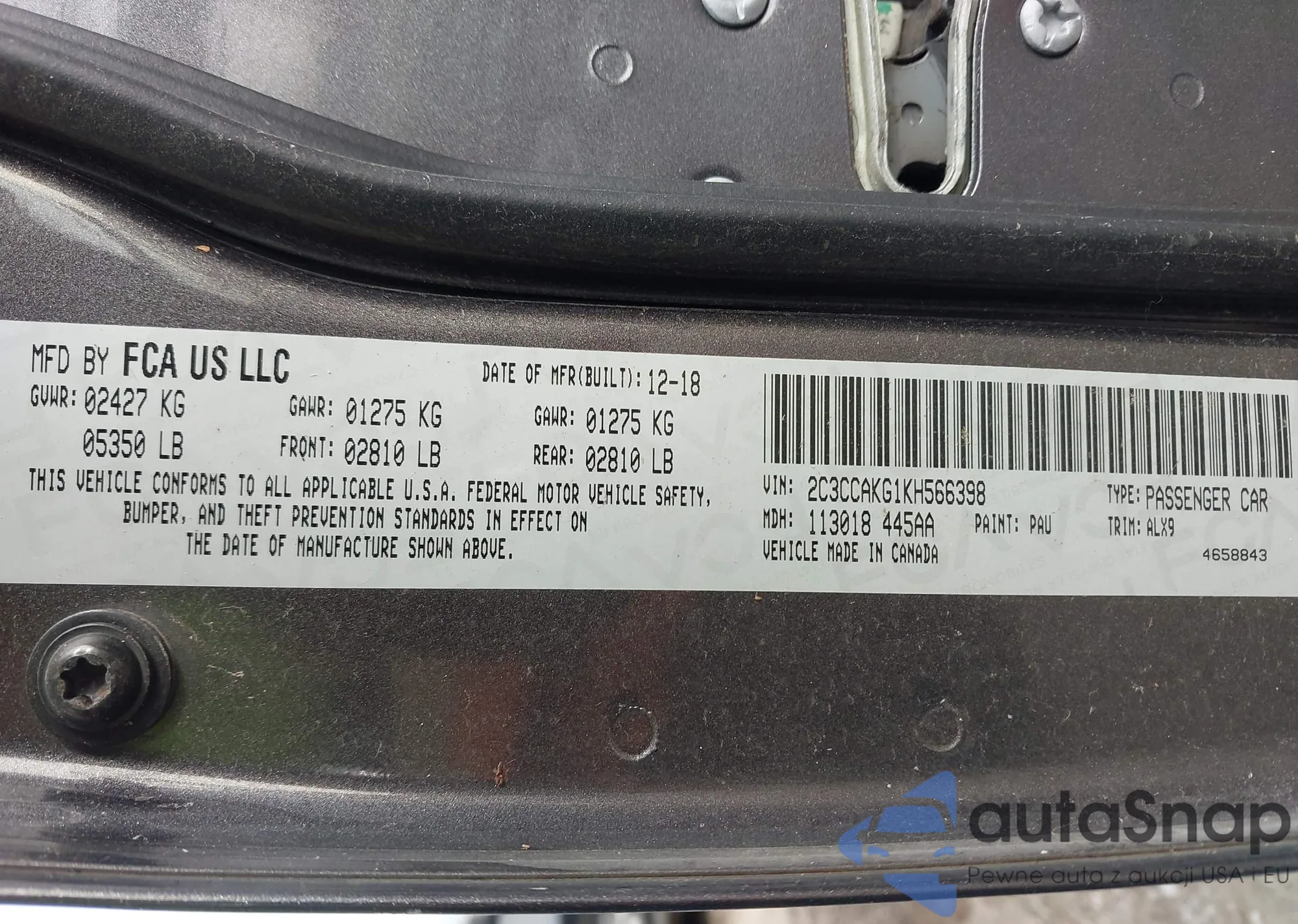 • VIN 2C3CCAKG1KH566398