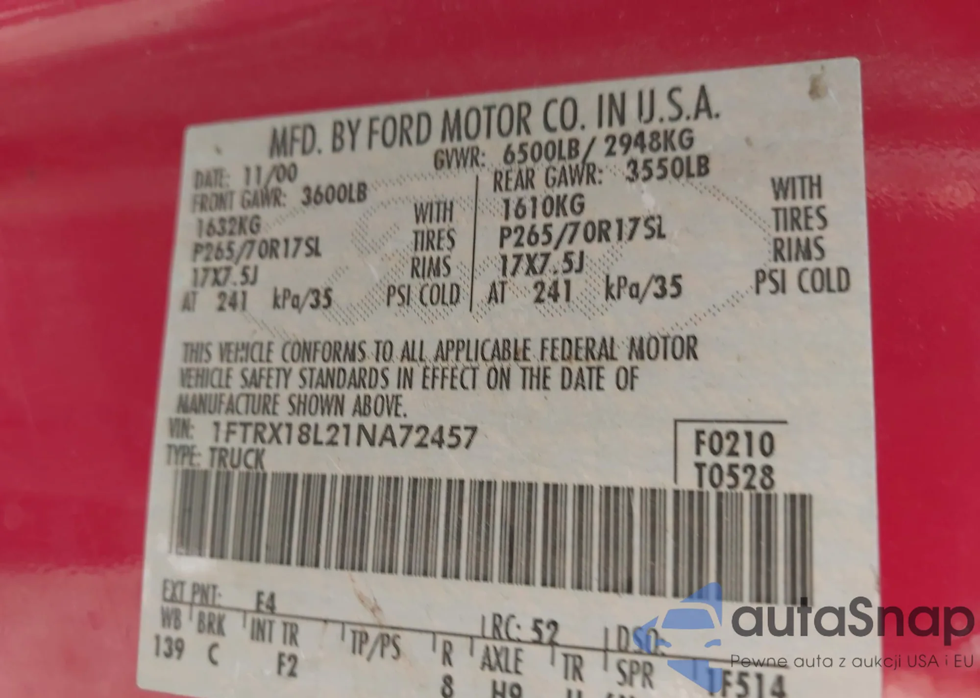 • VIN 1FTRX18L21NA72457