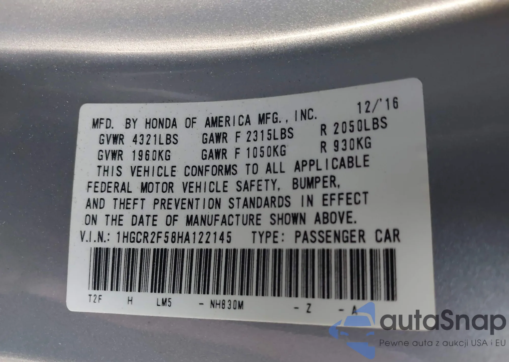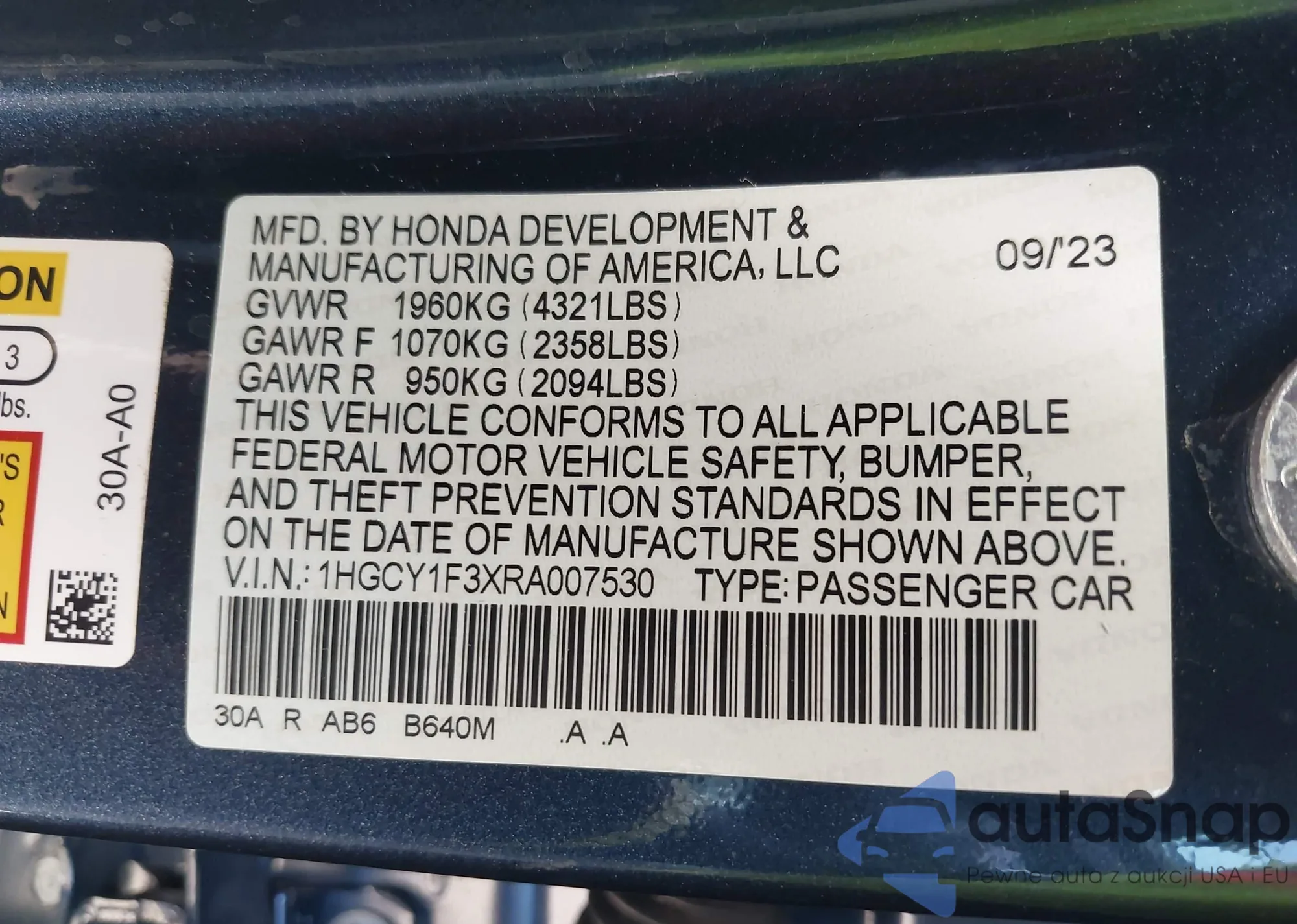 • VIN 1HGCY1F3XRA007530