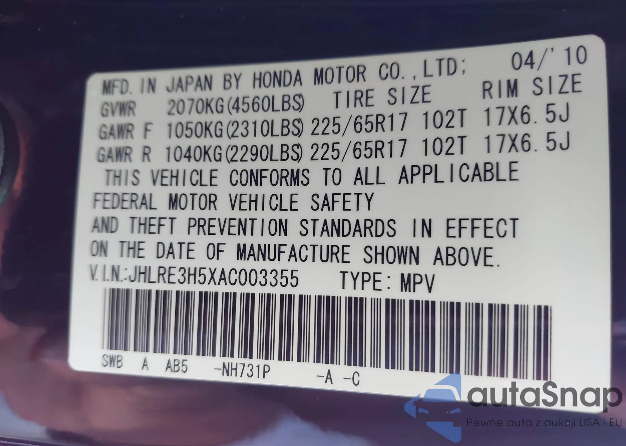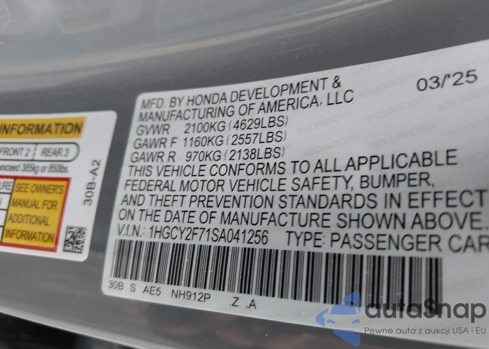 • VIN 1HGCY2F71SA041256