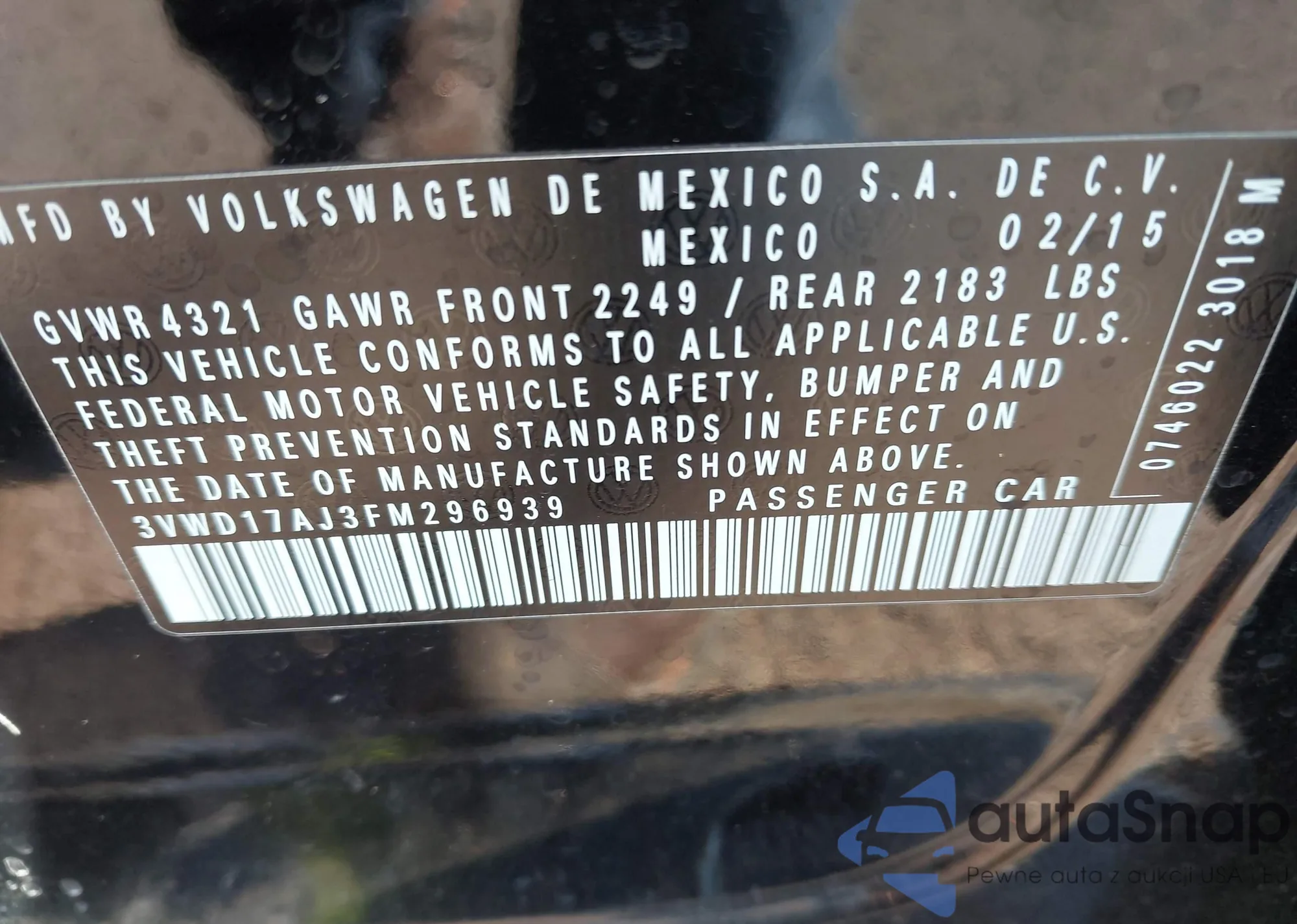 • VIN 3VWD17AJ3FM296939