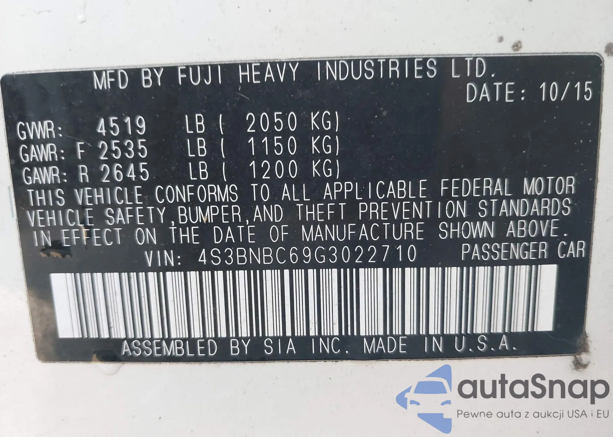 LOT: 43468517 VIN: 4S3BNBC69G3022710