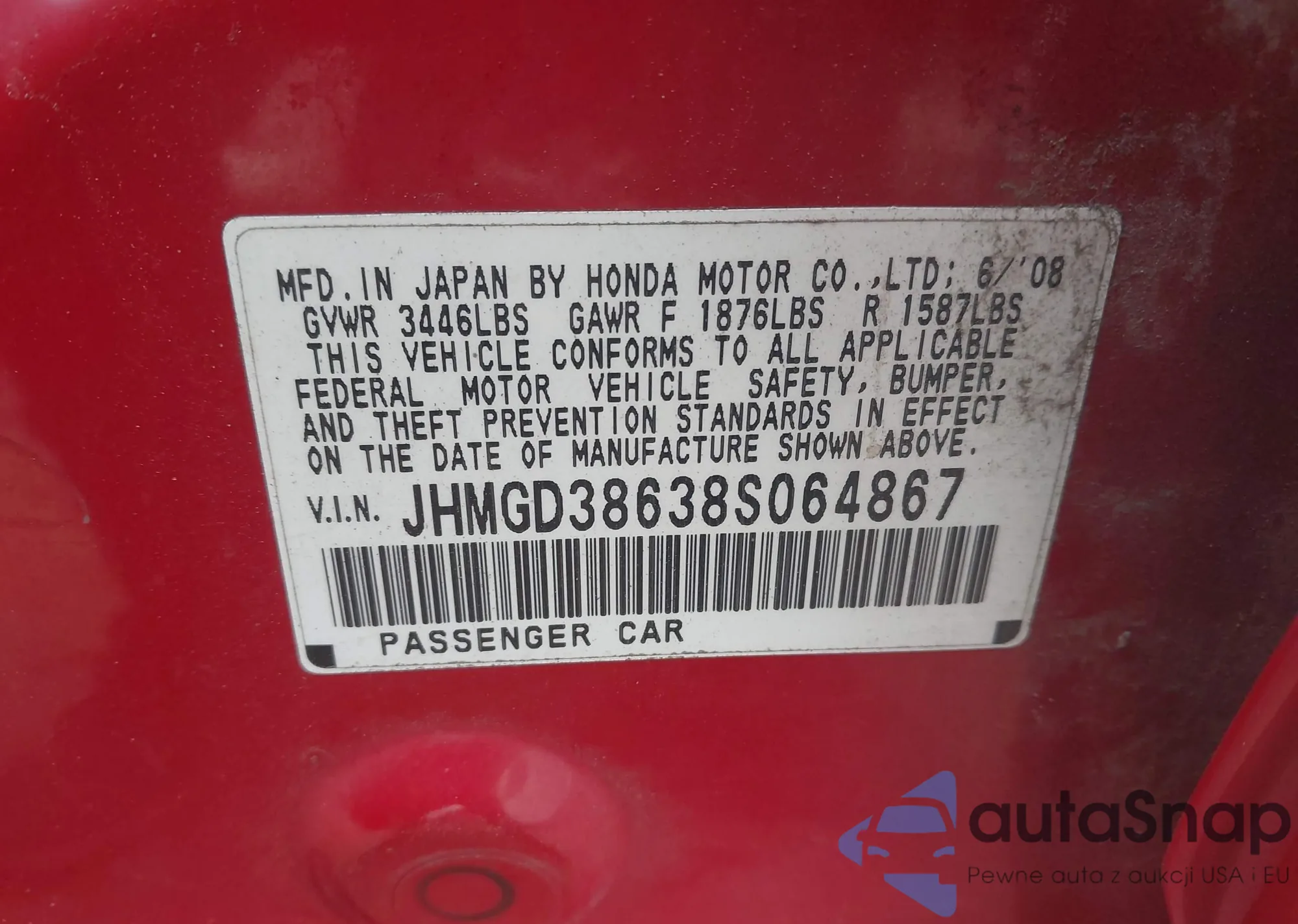 LOT: 43832153 VIN: JHMGD38638S064867
