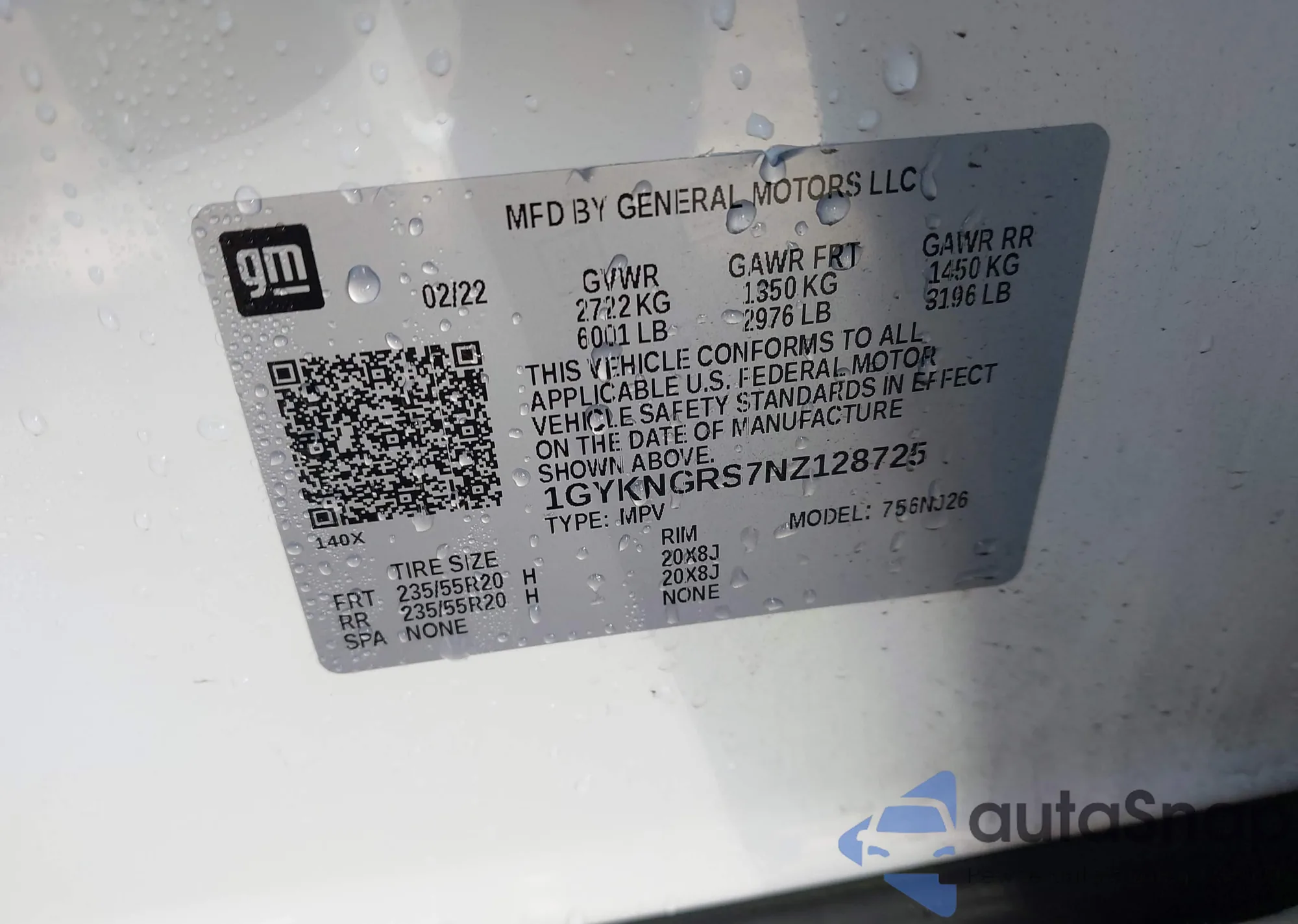 LOT: 43882082 VIN: 1GYKNGRS7NZ128725