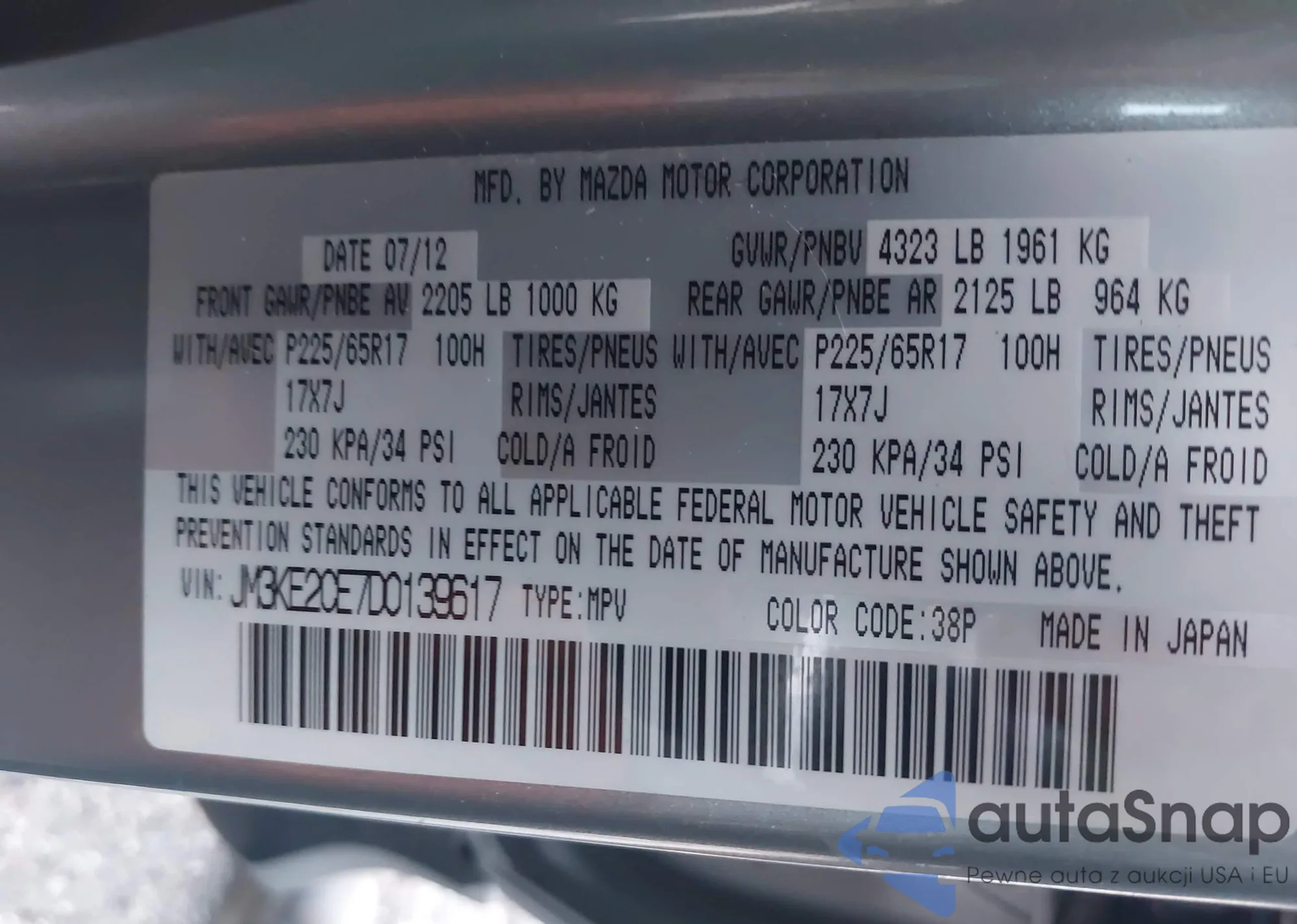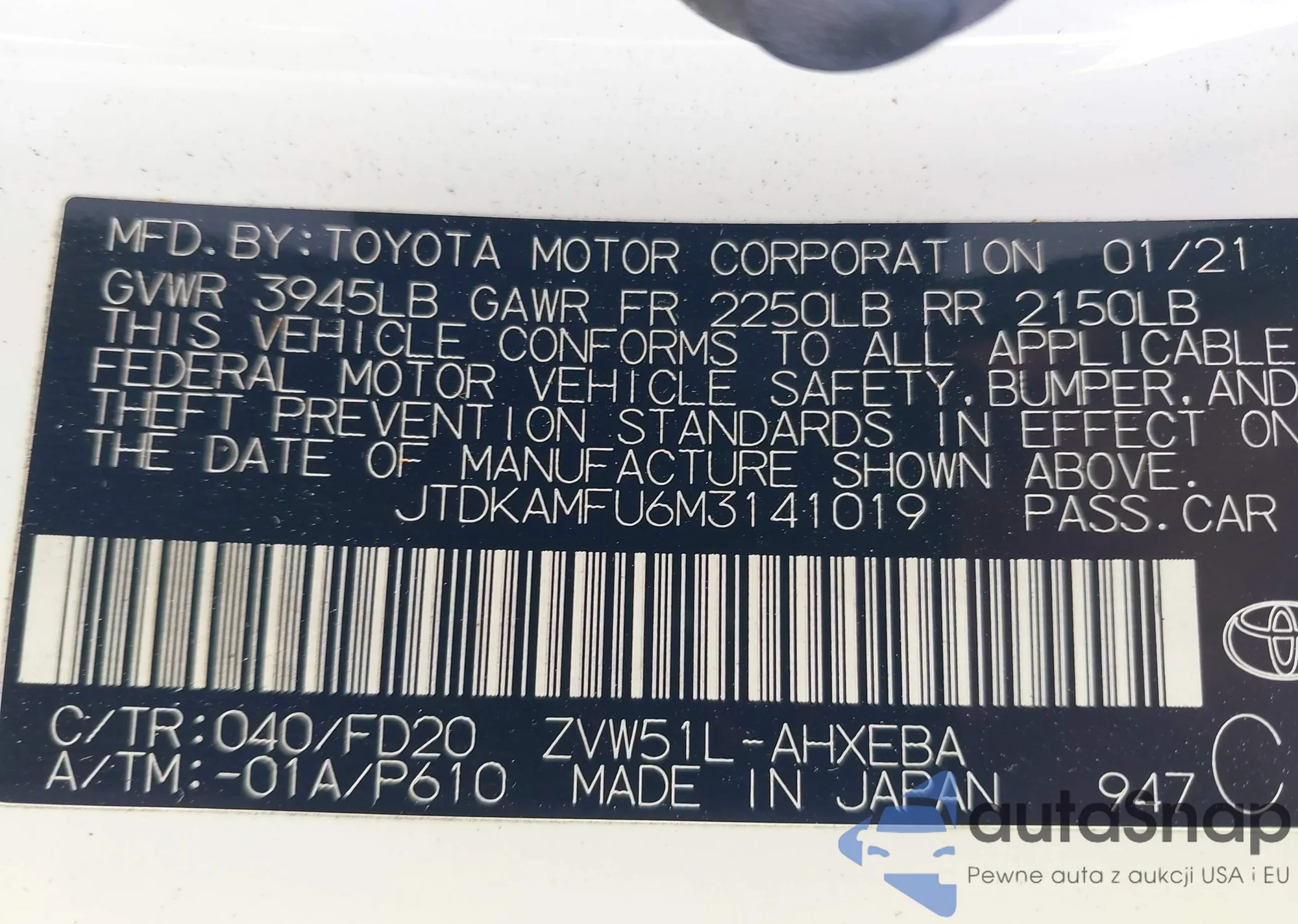 LOT: 43323686 VIN: JTDKAMFU6M3141019