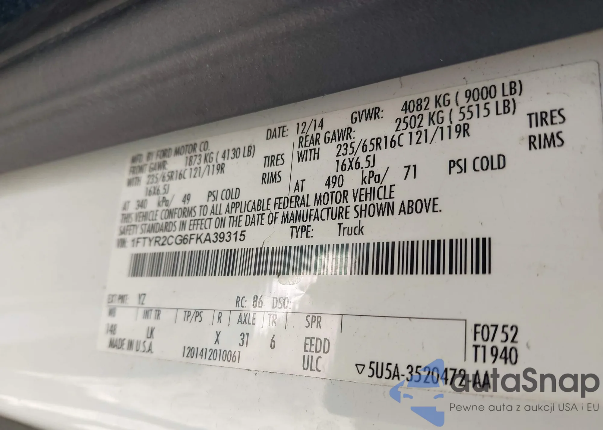 • VIN 1FTYR2CG6FKA39315