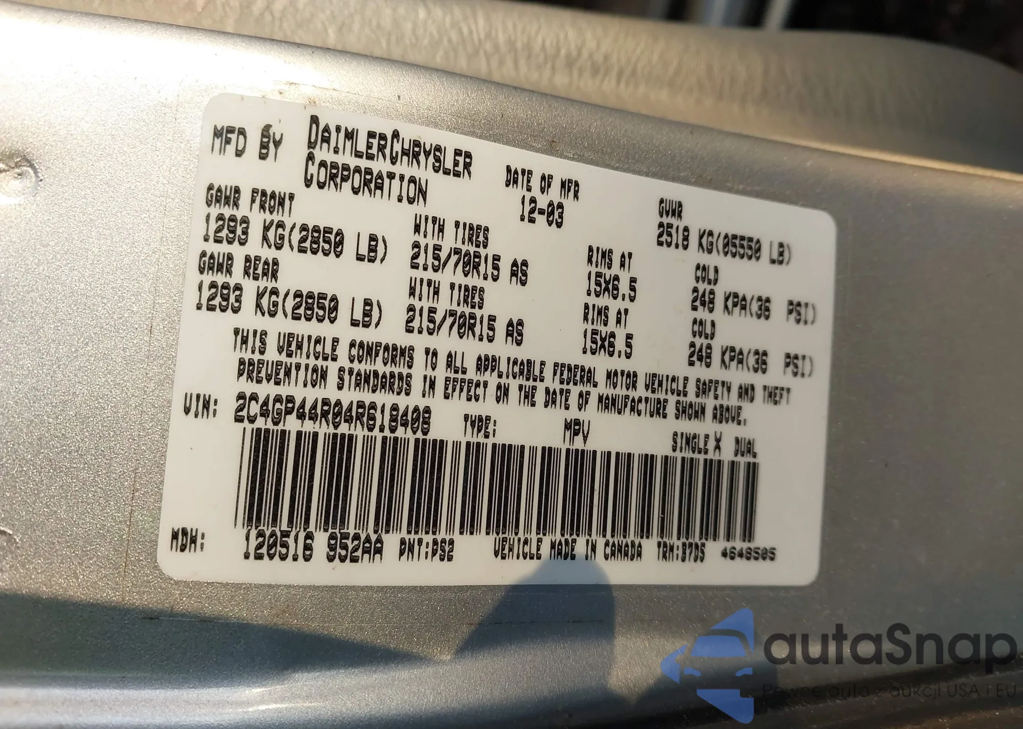 LOT: 43825509 VIN: 2C4GP44R04R618408