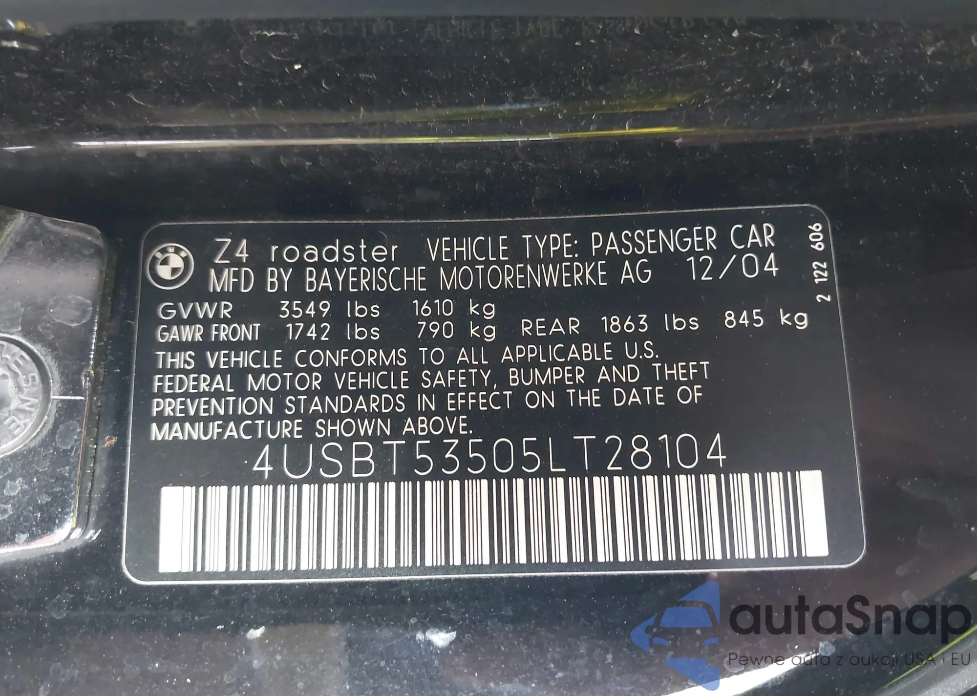 2005 BMW Z4 3.0I из США, поврежденный, VIN 4USBT53505LT28104