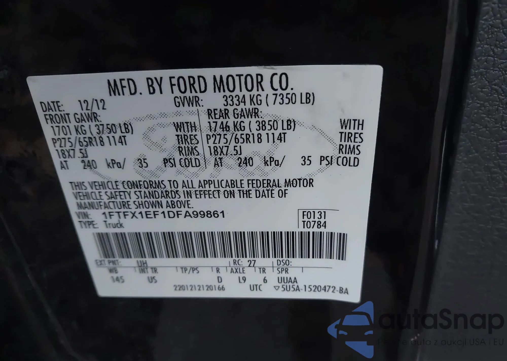 LOT: 43812899 VIN: 1FTFX1EF1DFA99861