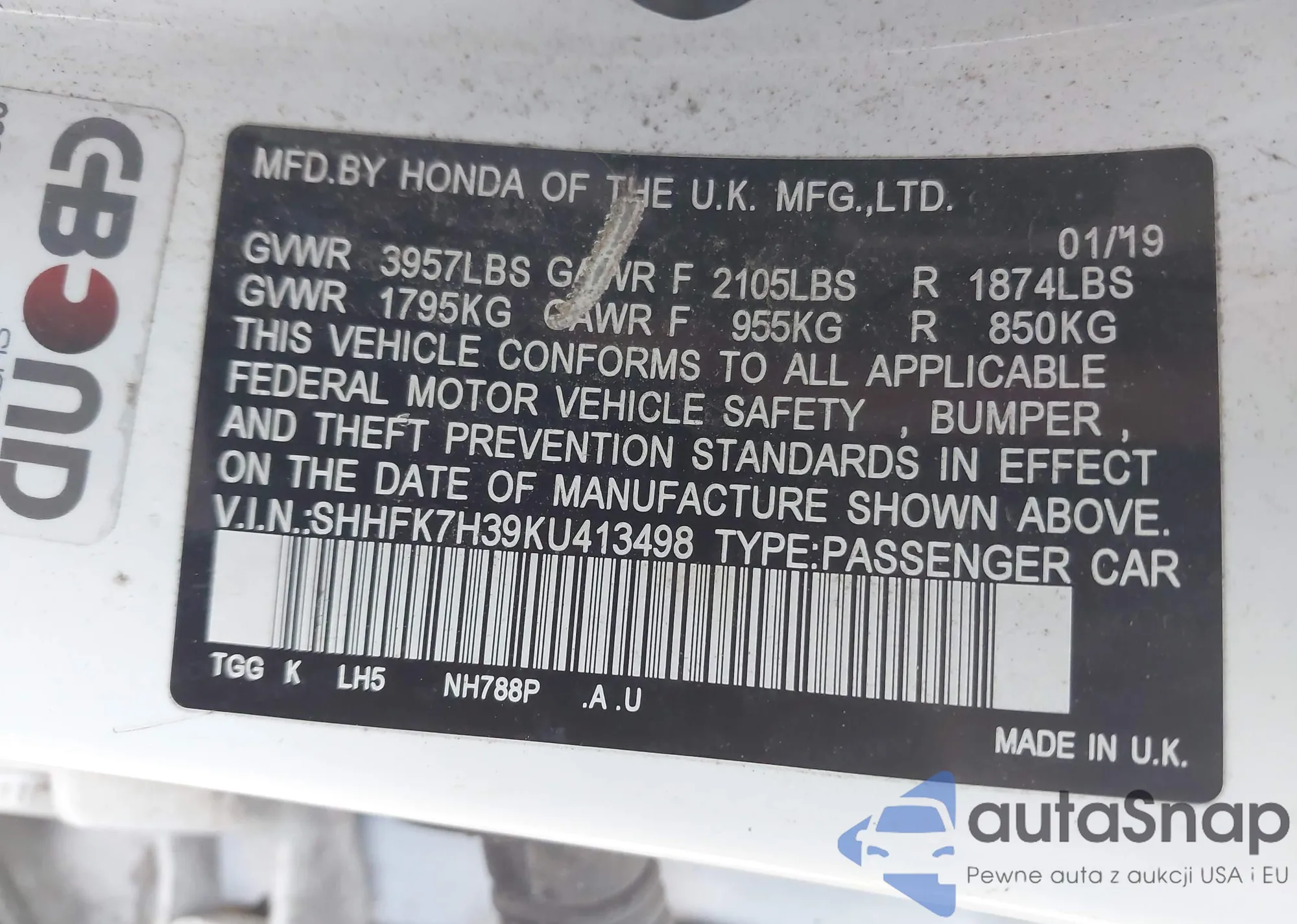 • VIN SHHFK7H39KU413498