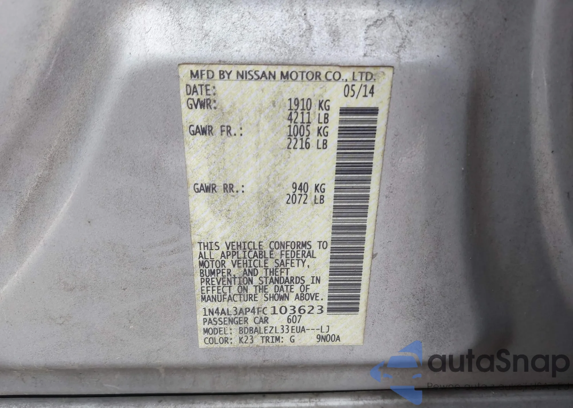 • VIN 1N4AL3AP4FC103623