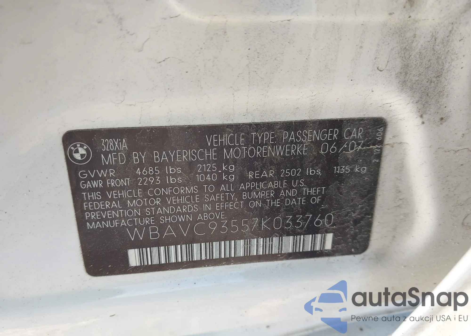 2007 BMW 328Xi из США, поврежденный, VIN WBAVC93557K033760