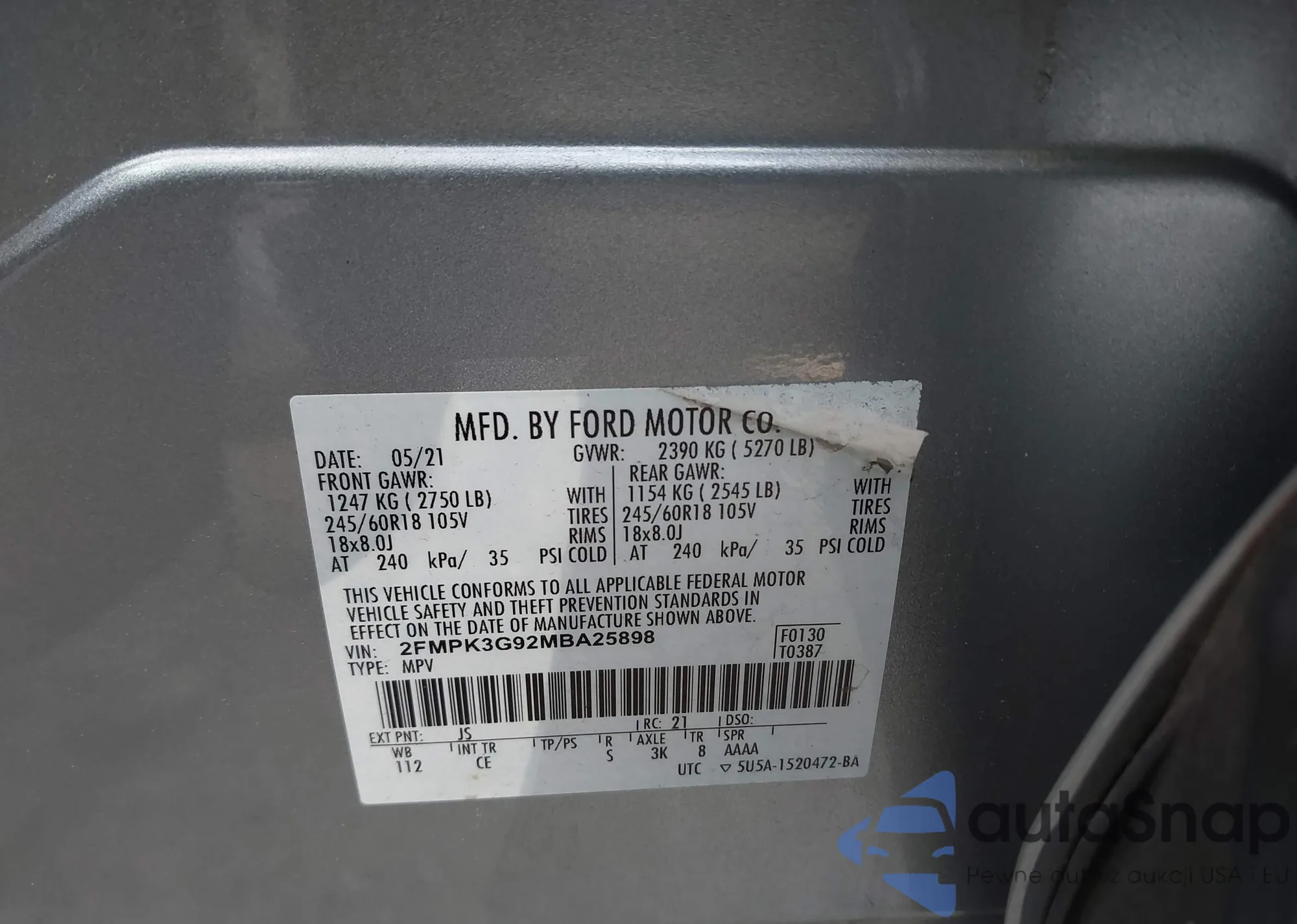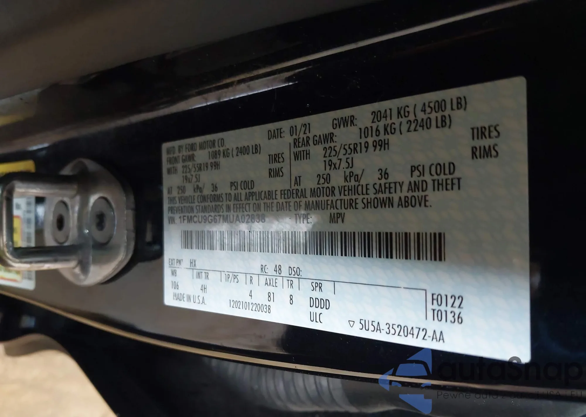 LOT: 43766155 VIN: 1FMCU9G67MUA02838