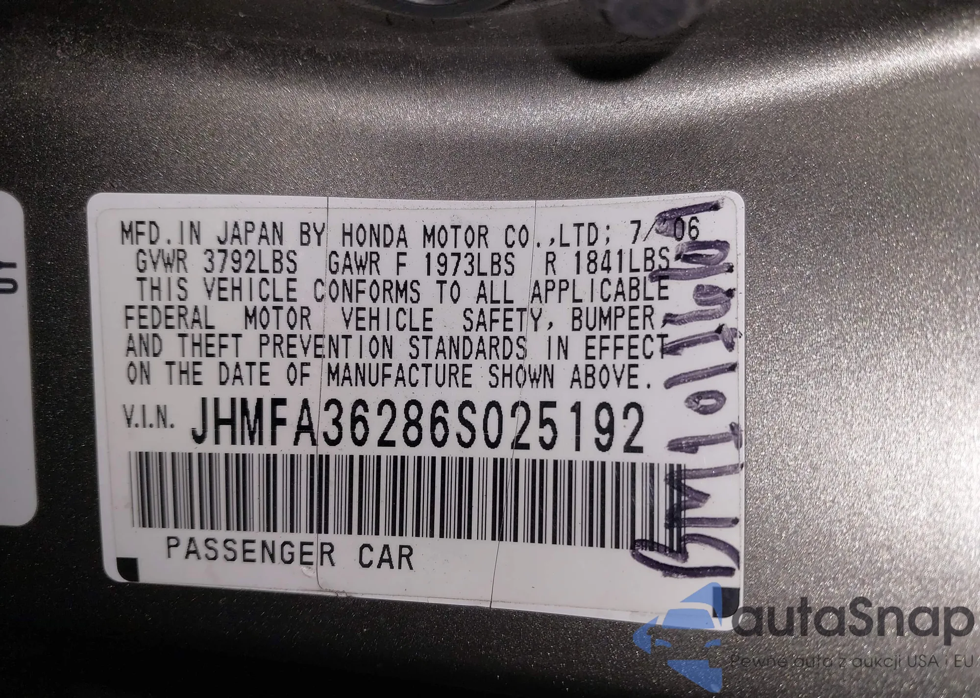LOT: 43844798 VIN: JHMFA36286S025192