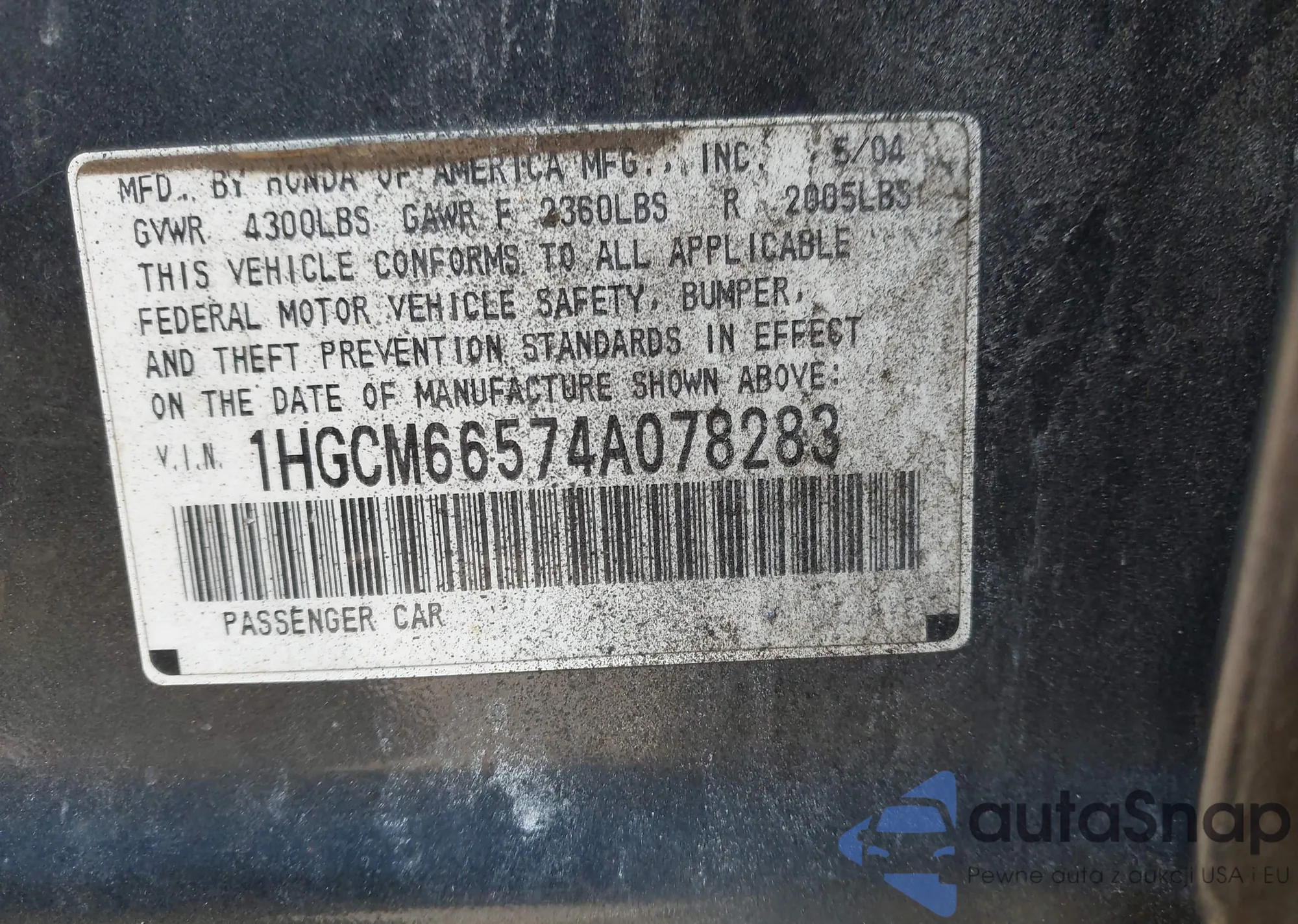 LOT: 43869402 VIN: 1HGCM66574A078283