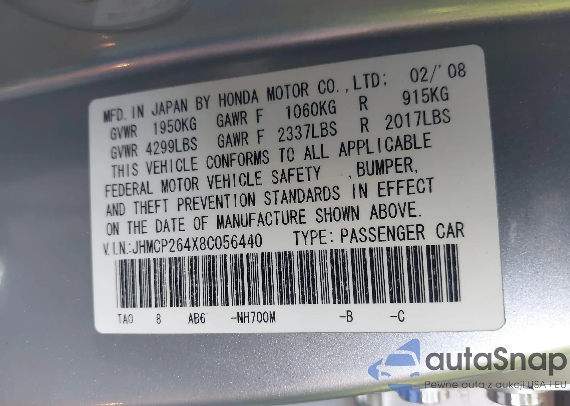 LOT: 43927399 VIN: JHMCG56431C021407