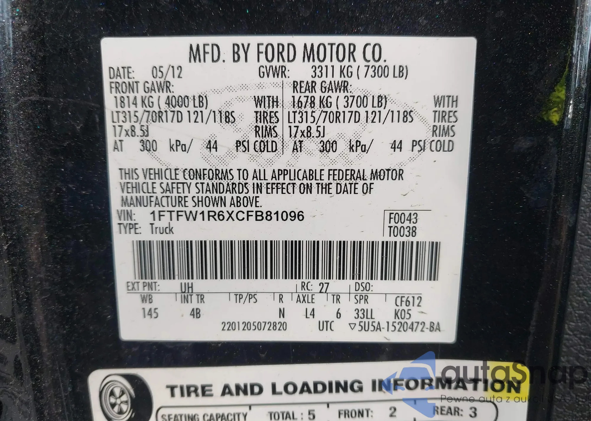 • VIN 1FTFW1R6XCFB81096