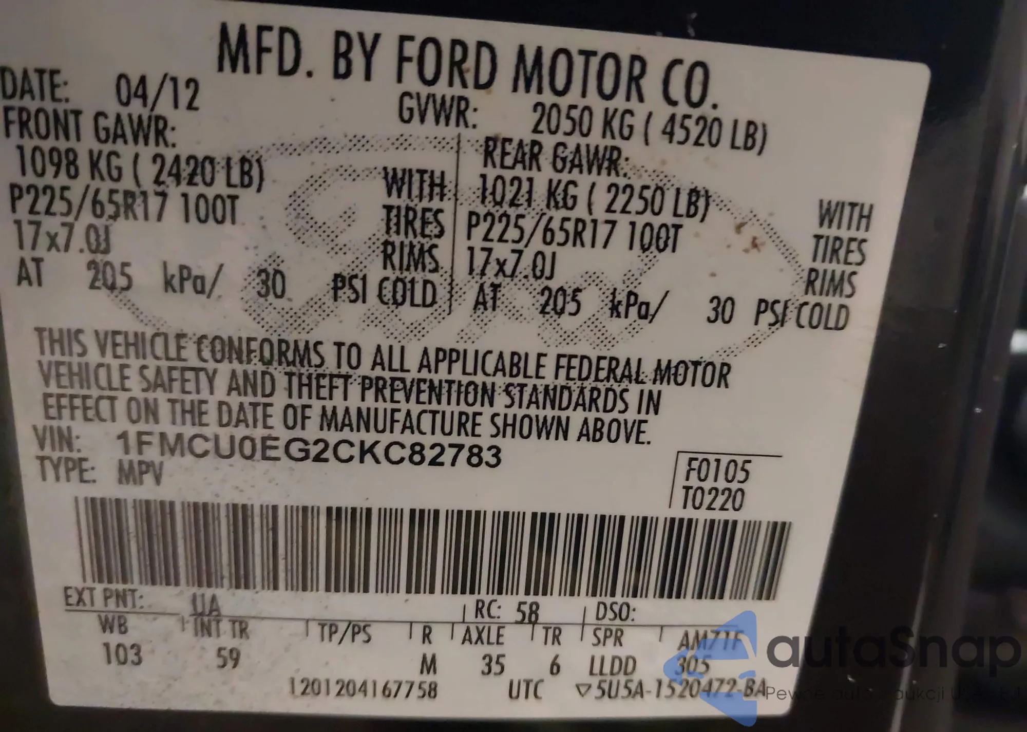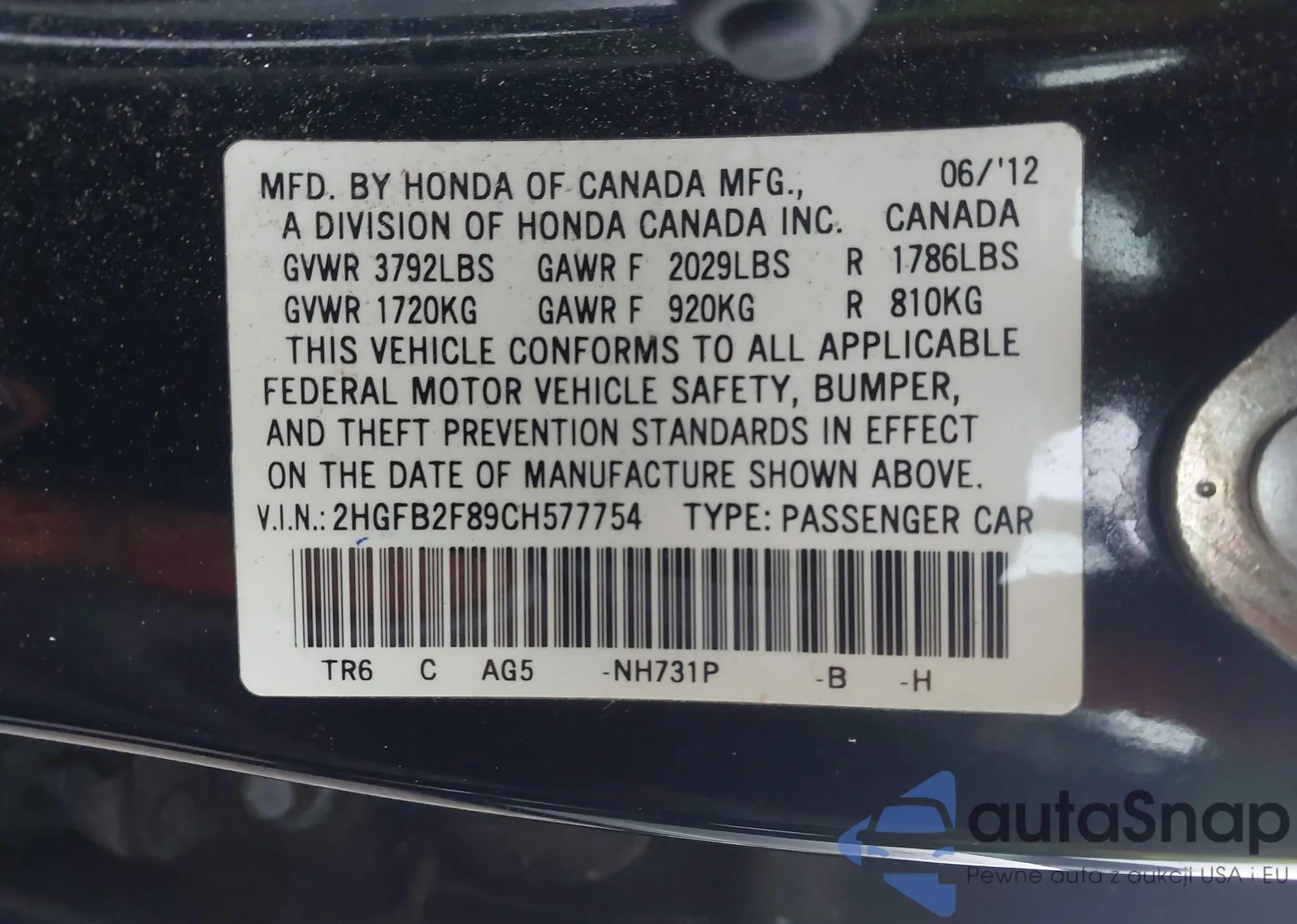 • VIN 2HGFB2F89CH577754