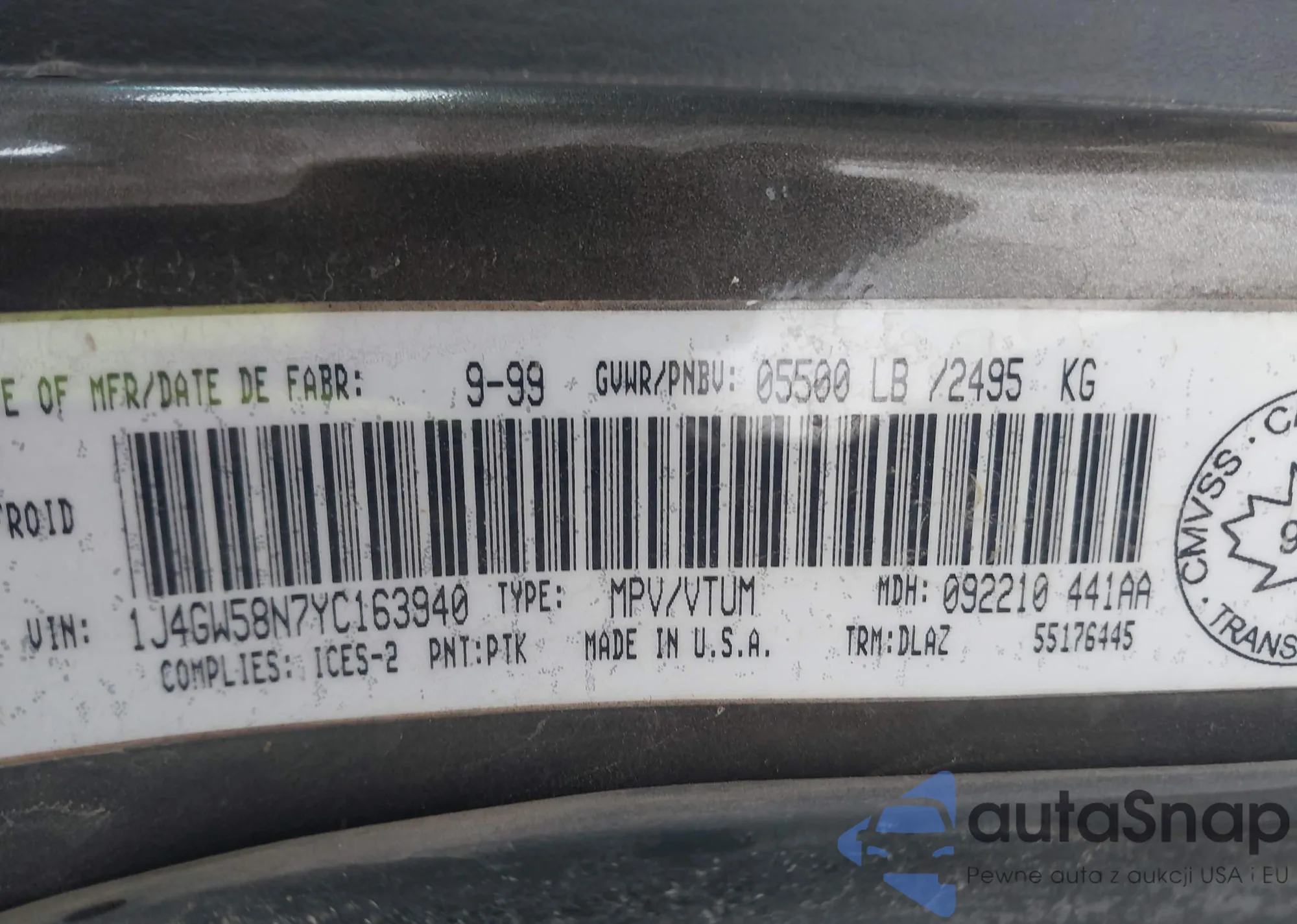LOT: 43880594 VIN: 1J4GW58N7YC163940