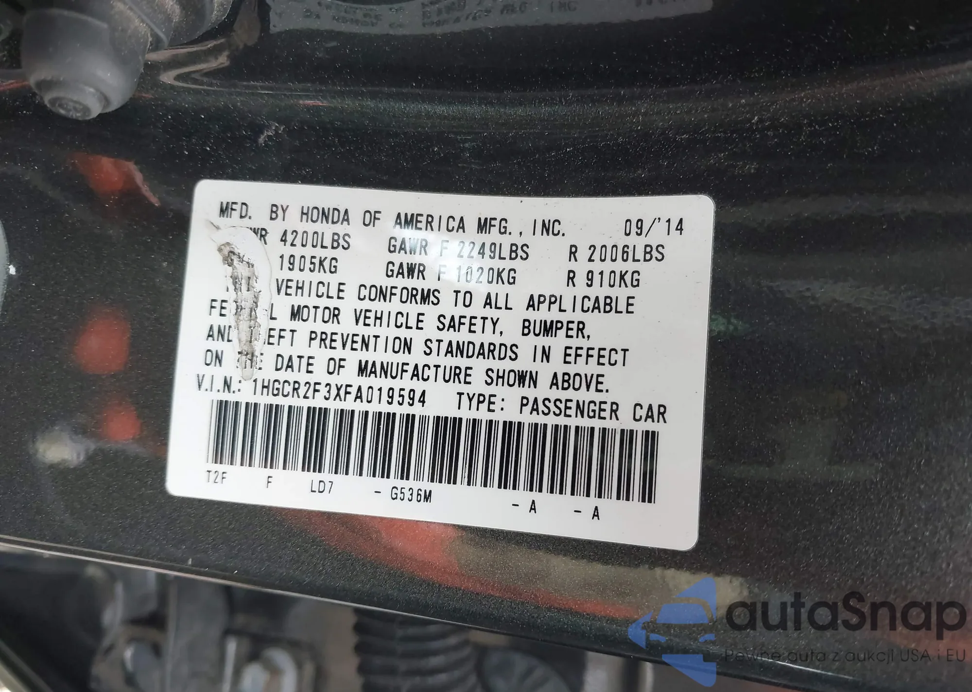 LOT: 43668432 VIN: 2HGFG3B86CH550251