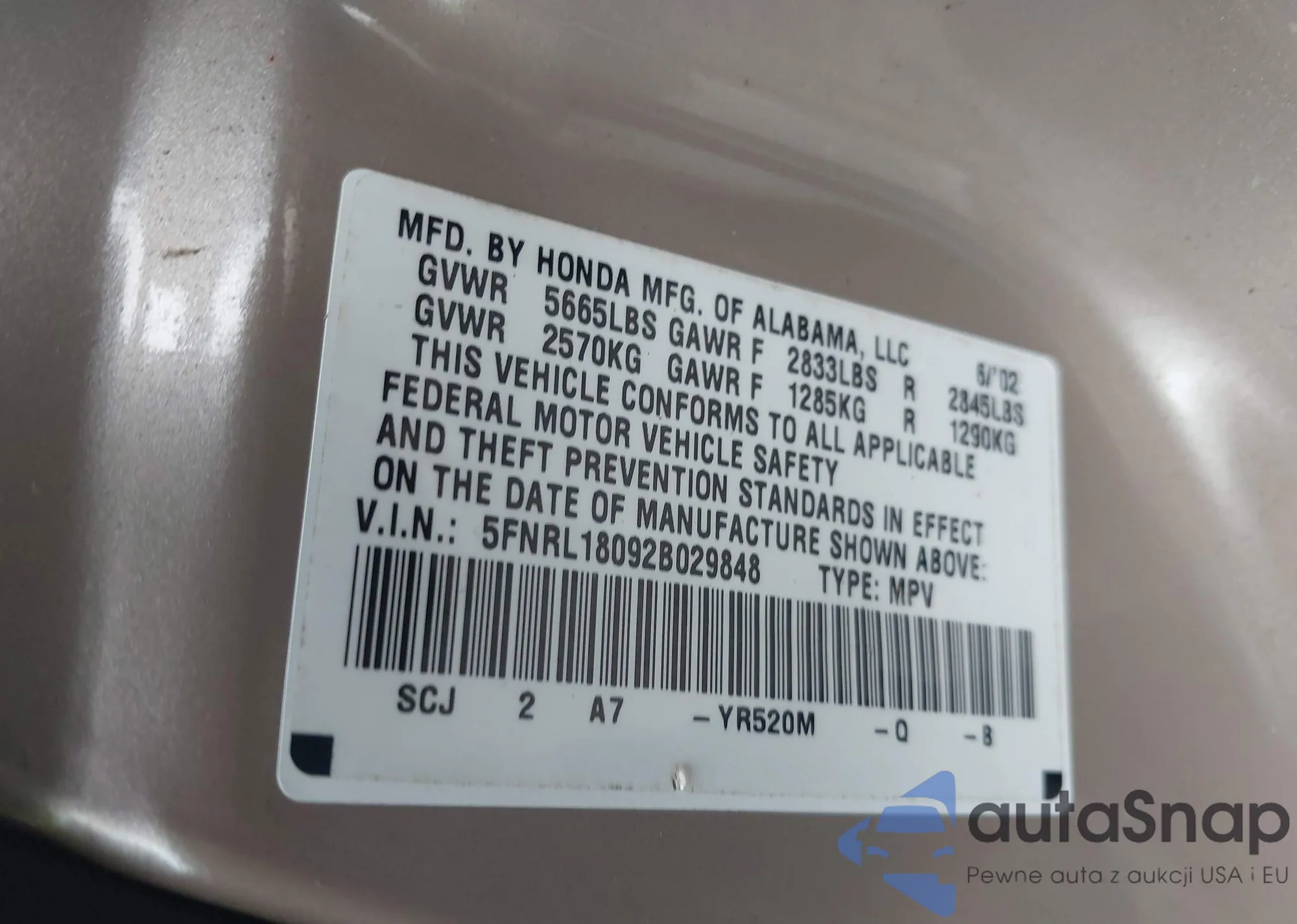 LOT: 43889003 VIN: 5FNRL18092B029848