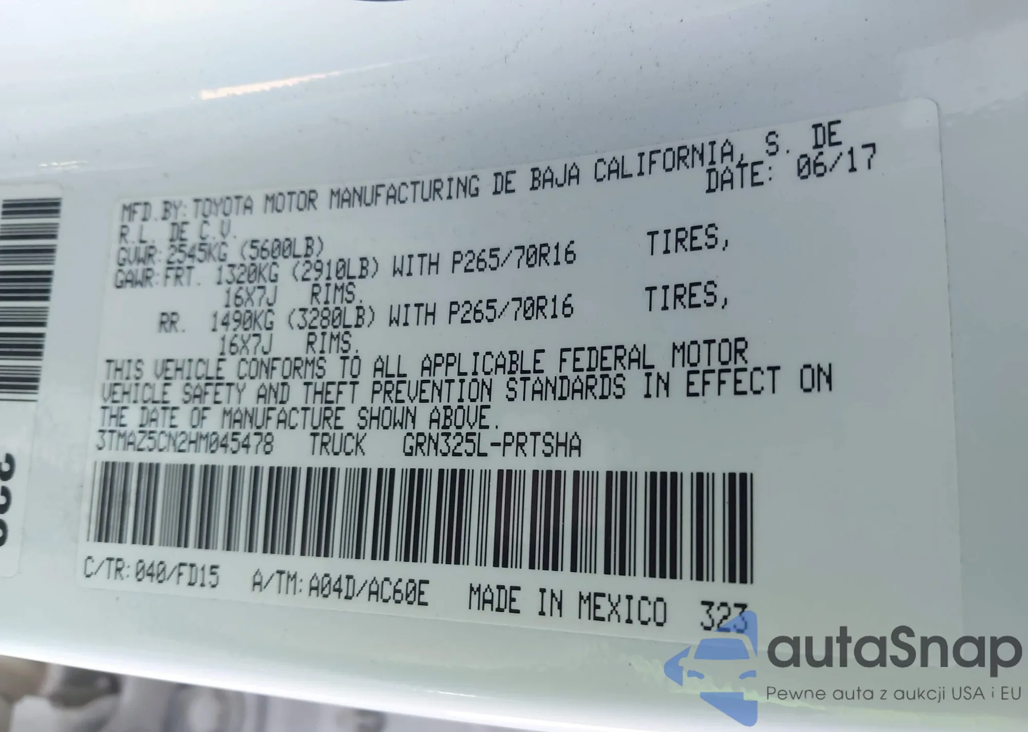 LOT: 43942073 VIN: 3TMAZ5CN2HM045478