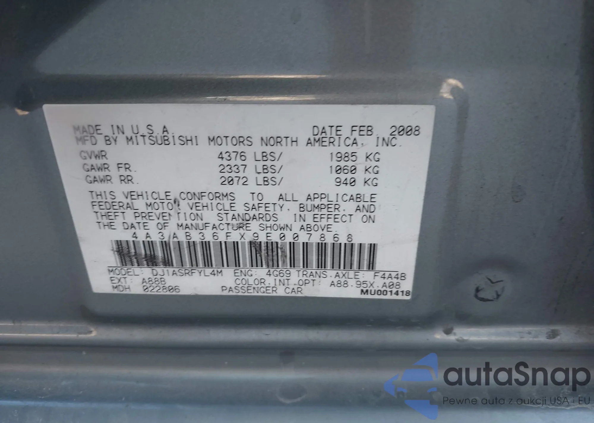 • VIN 4A3AB36FX9E007868